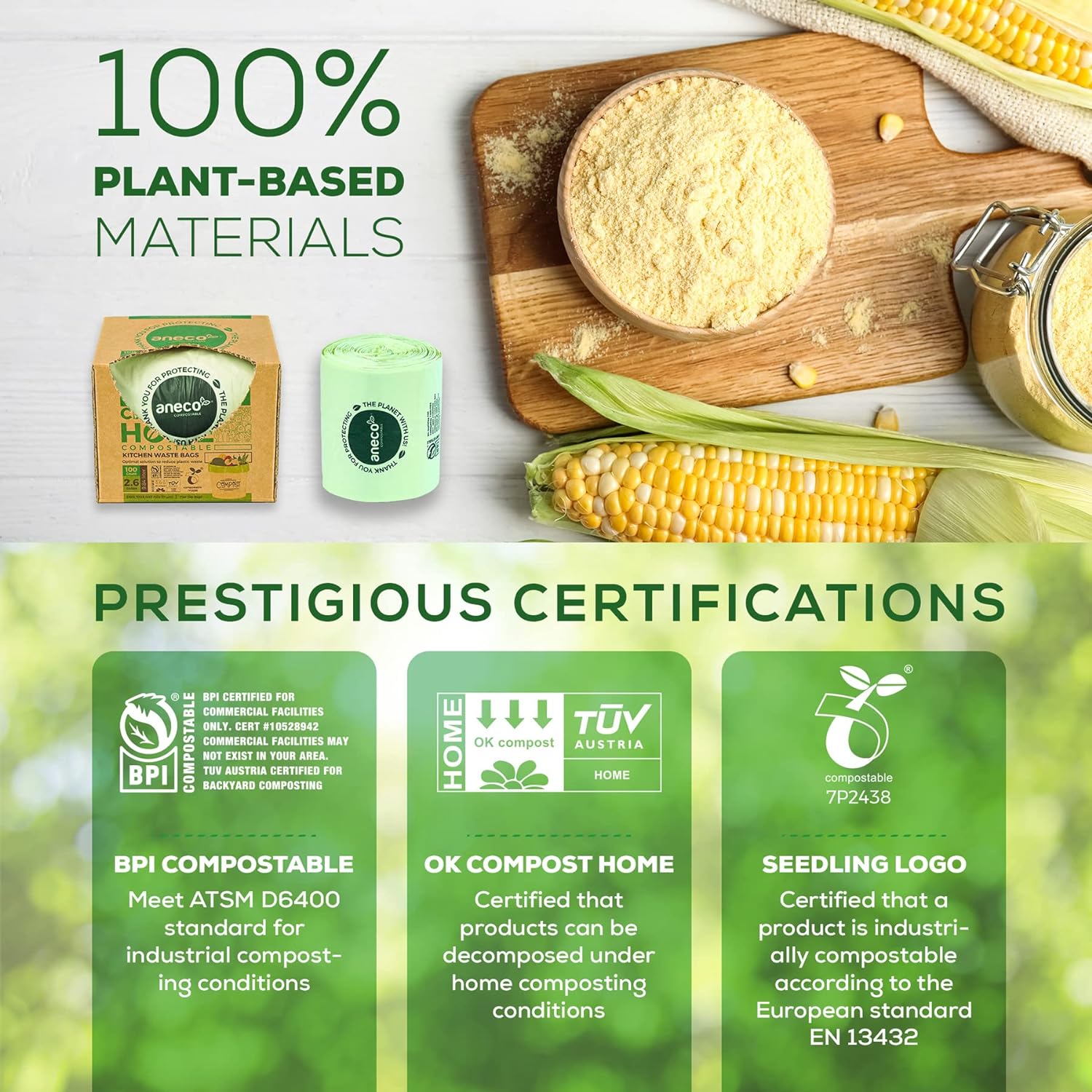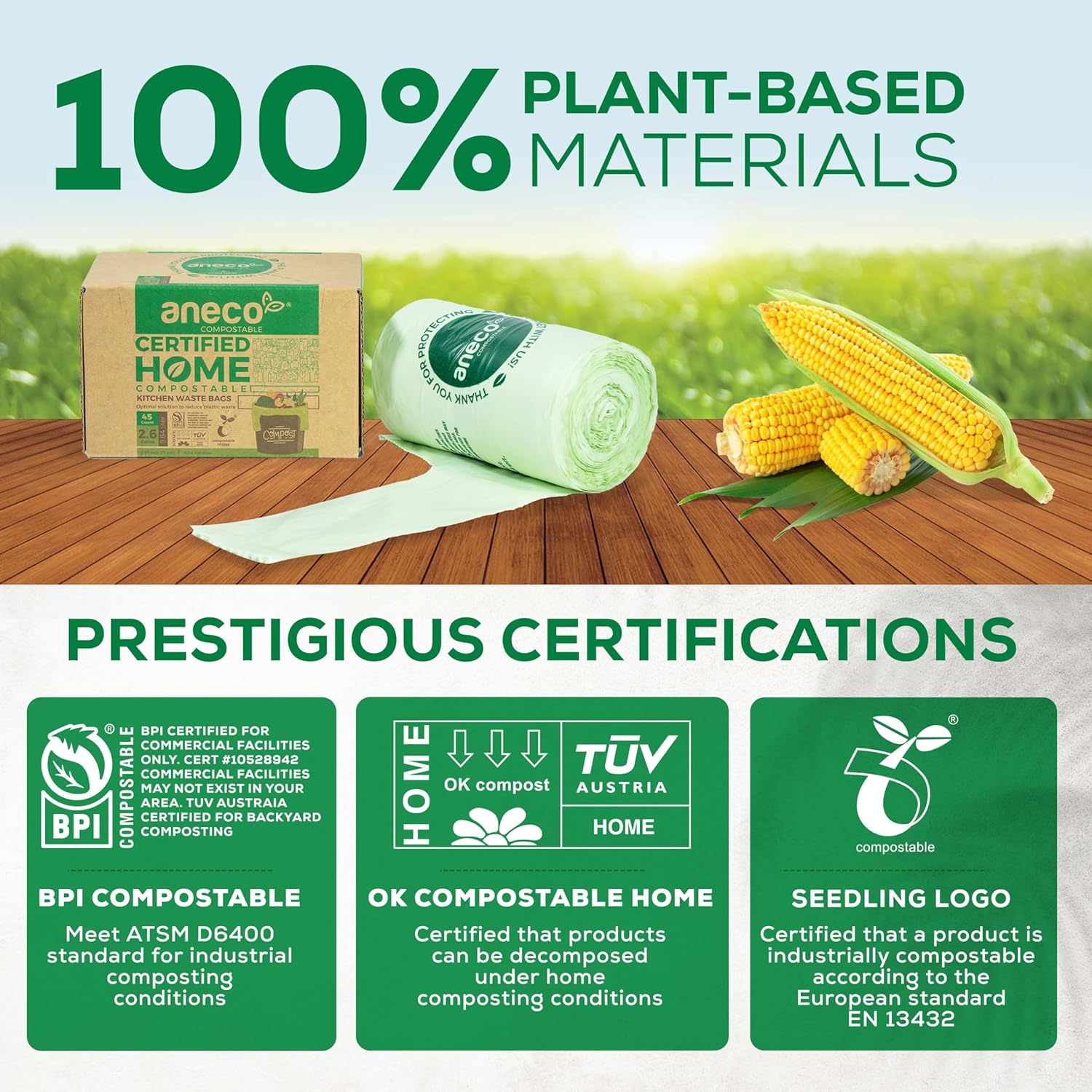 - ��� Made from entirely plastic-free materials such as corn starch and plant-based materials, ANECO 2.6 gallon trash bag decomposes fully into CO2, water and organic biomass after 6-12 months, leaving no traces of plastic in the environment.