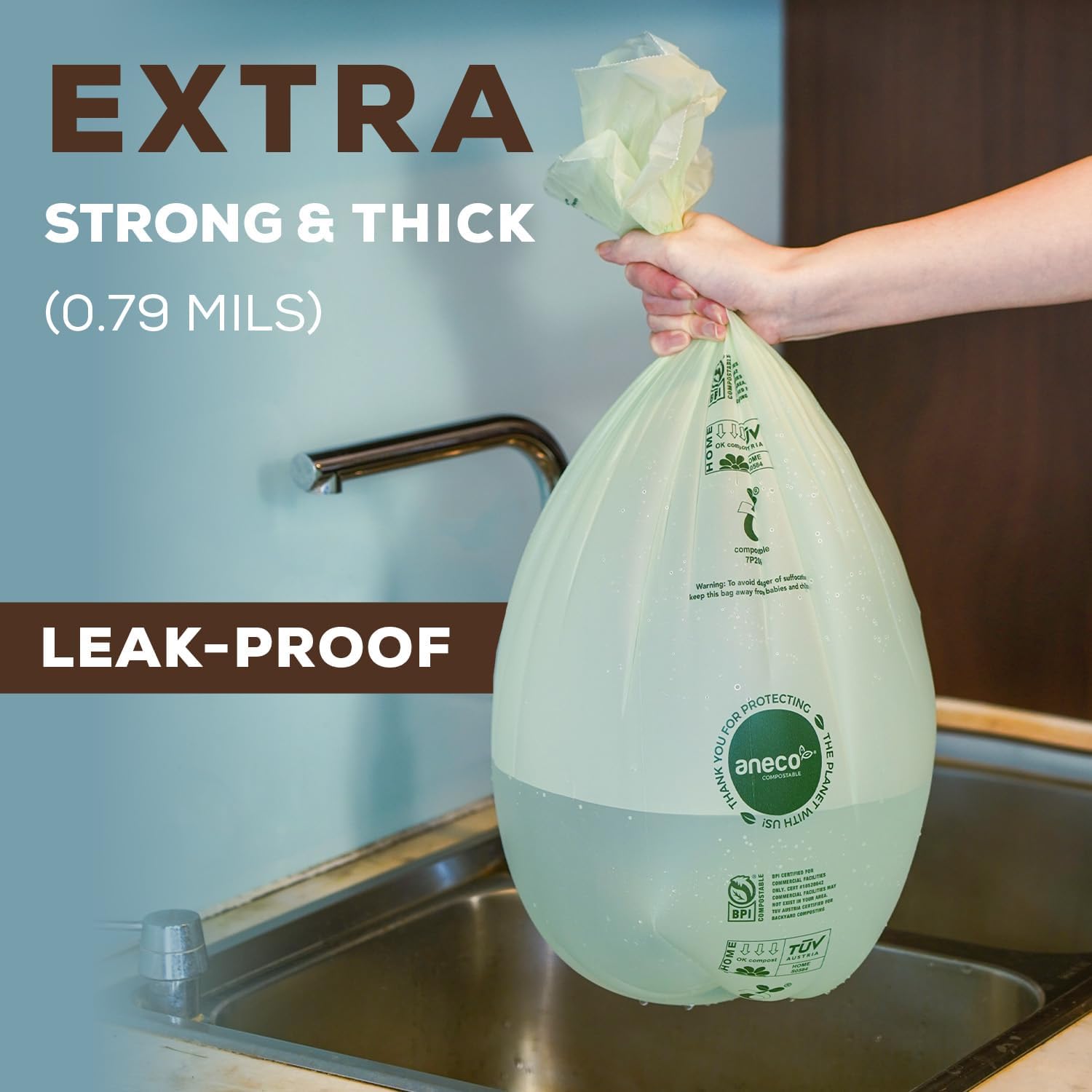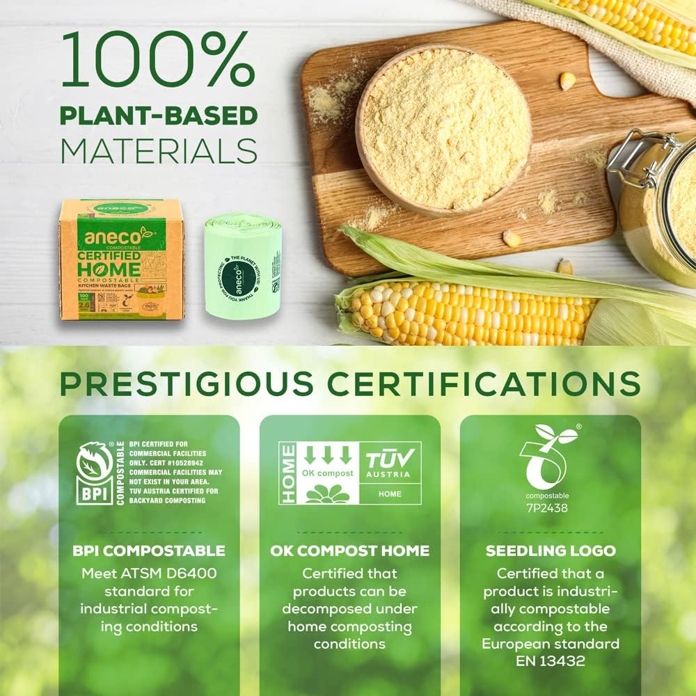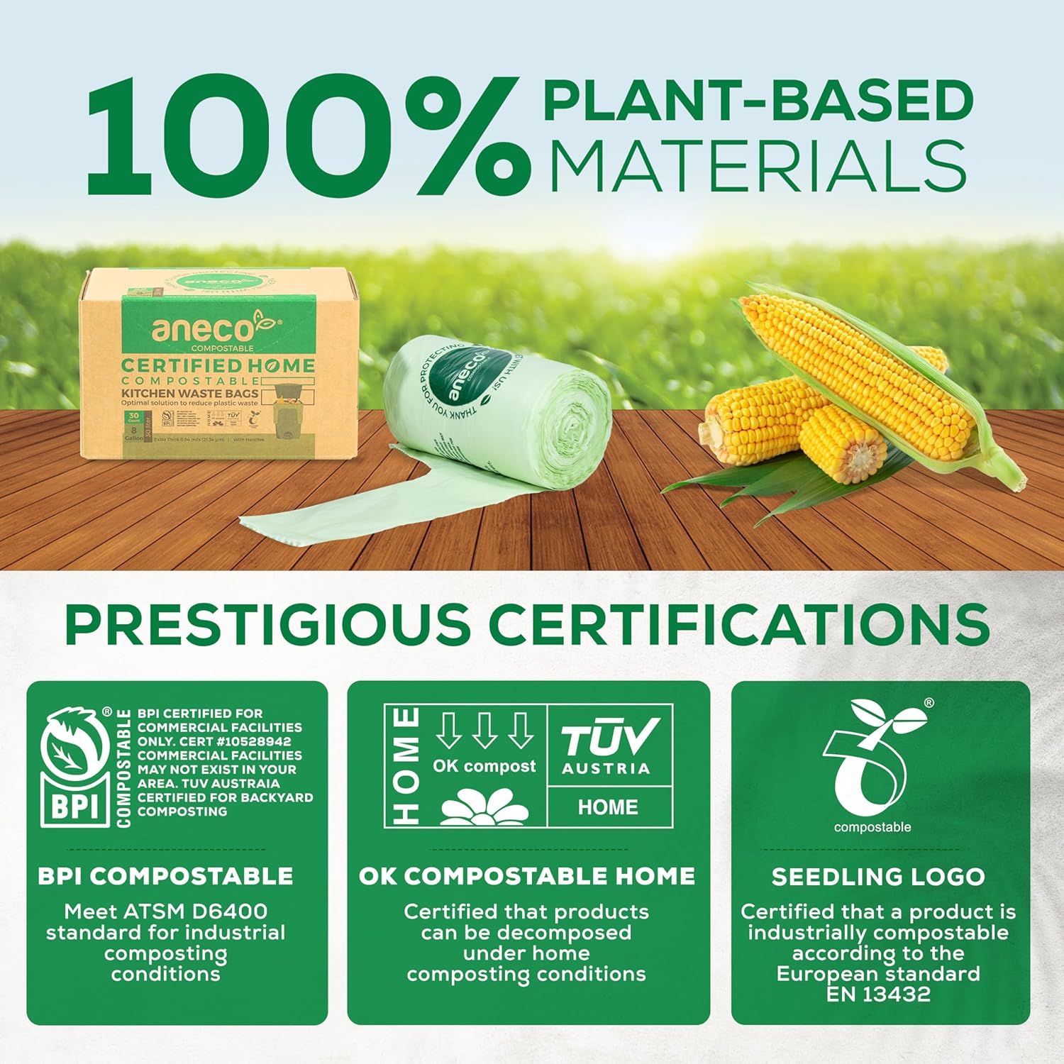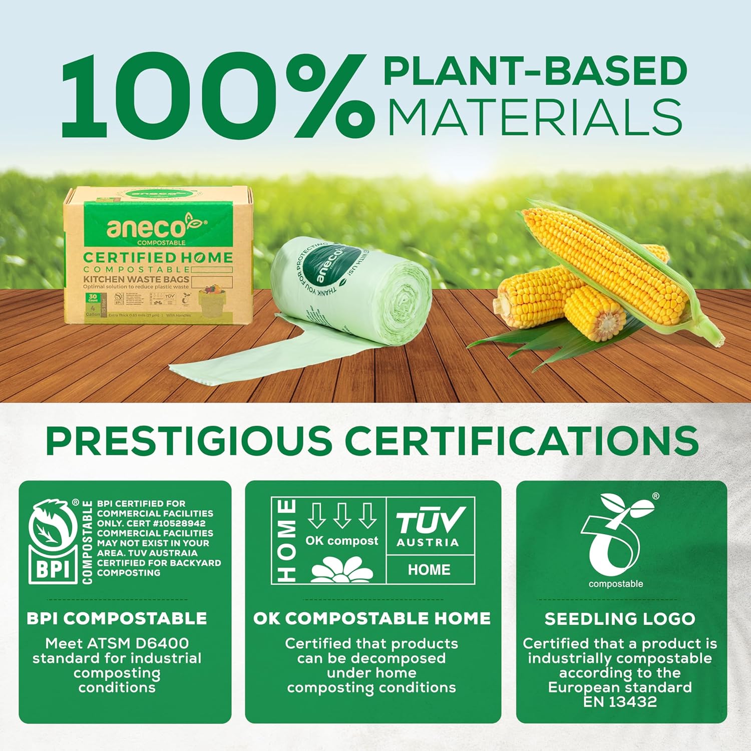 - ��� Proud to be one of few HOME compostable trash bags in the market, ANECO Compostable bag can break down completely not only in industrial facilities but also in home system. Use these bags to collect kitchen scraps and put them straight into the compost dumpster, or bury and turn them into valuable compost for your garden