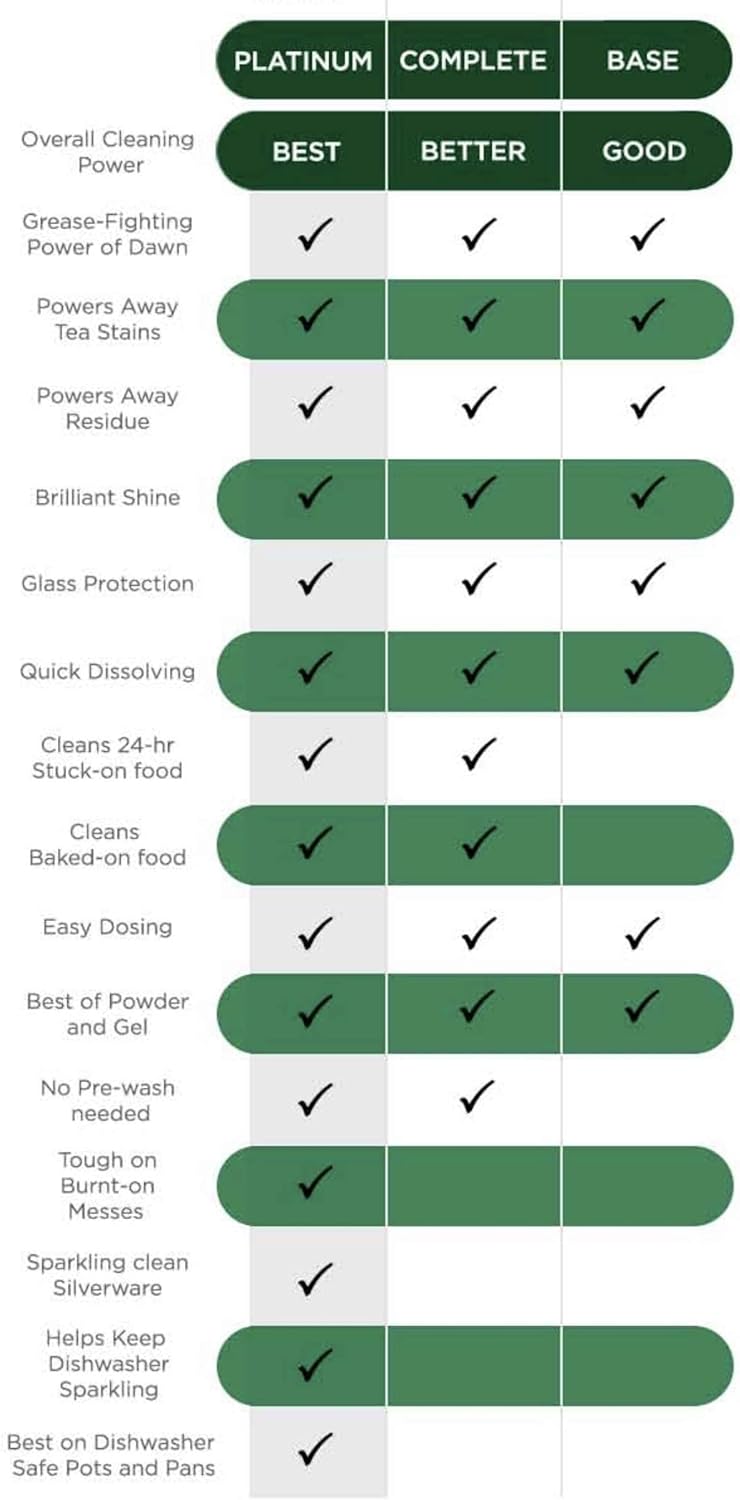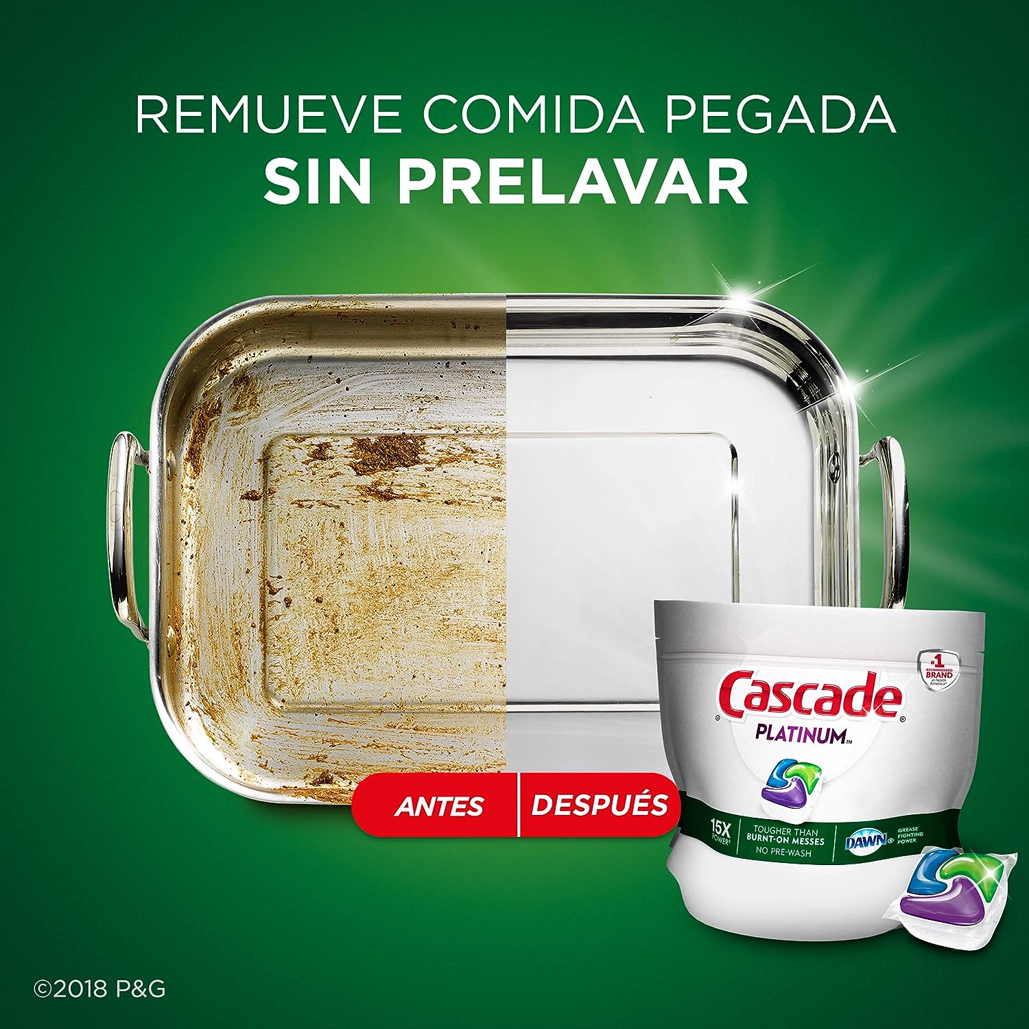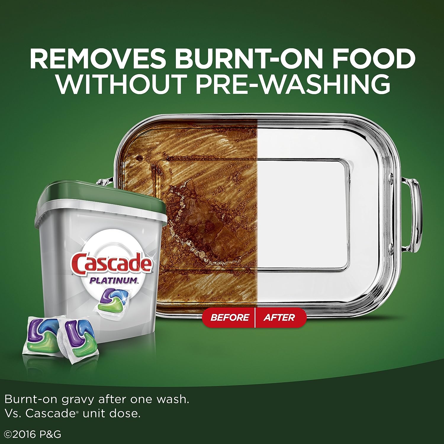 • Cascade Platinum ActionPacs dishwasher detergent cleans burnt-on messes in just one wash, with no pre-wash needed.