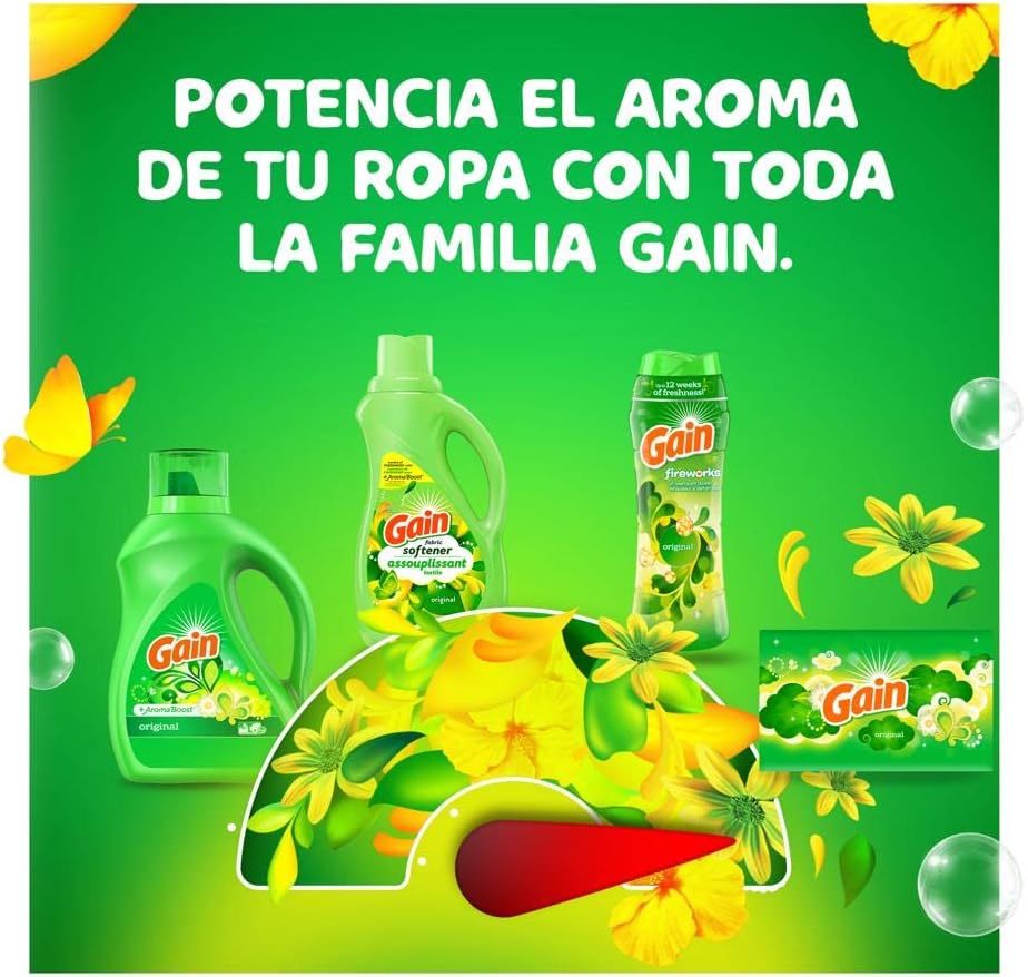 - AROMA BOOST: Gain + aroma boost liquid laundry detergent lifts away dirt and locks in an amazing scent to keep your laundry smelling excellent even after six weeks. From wash until wear, experience the power of Gain laundry detergent