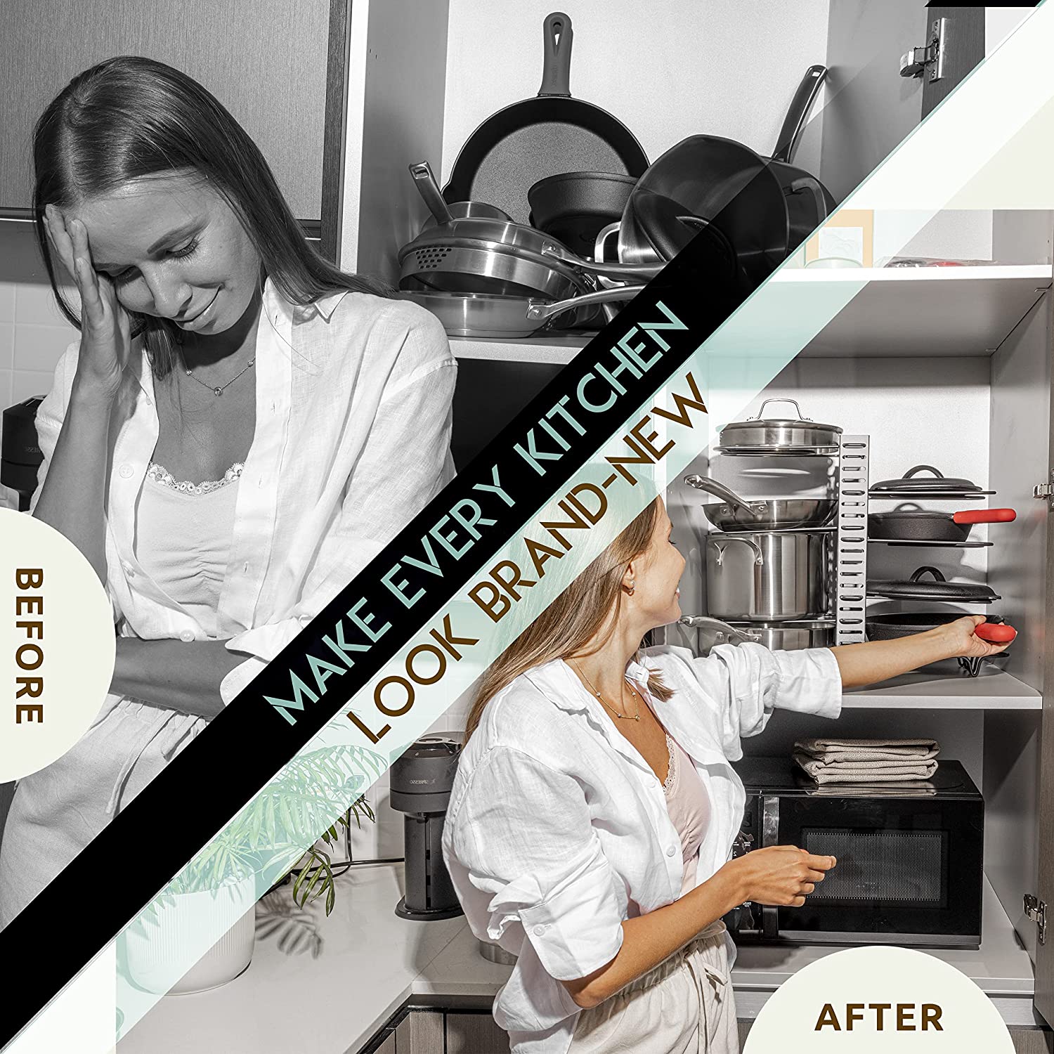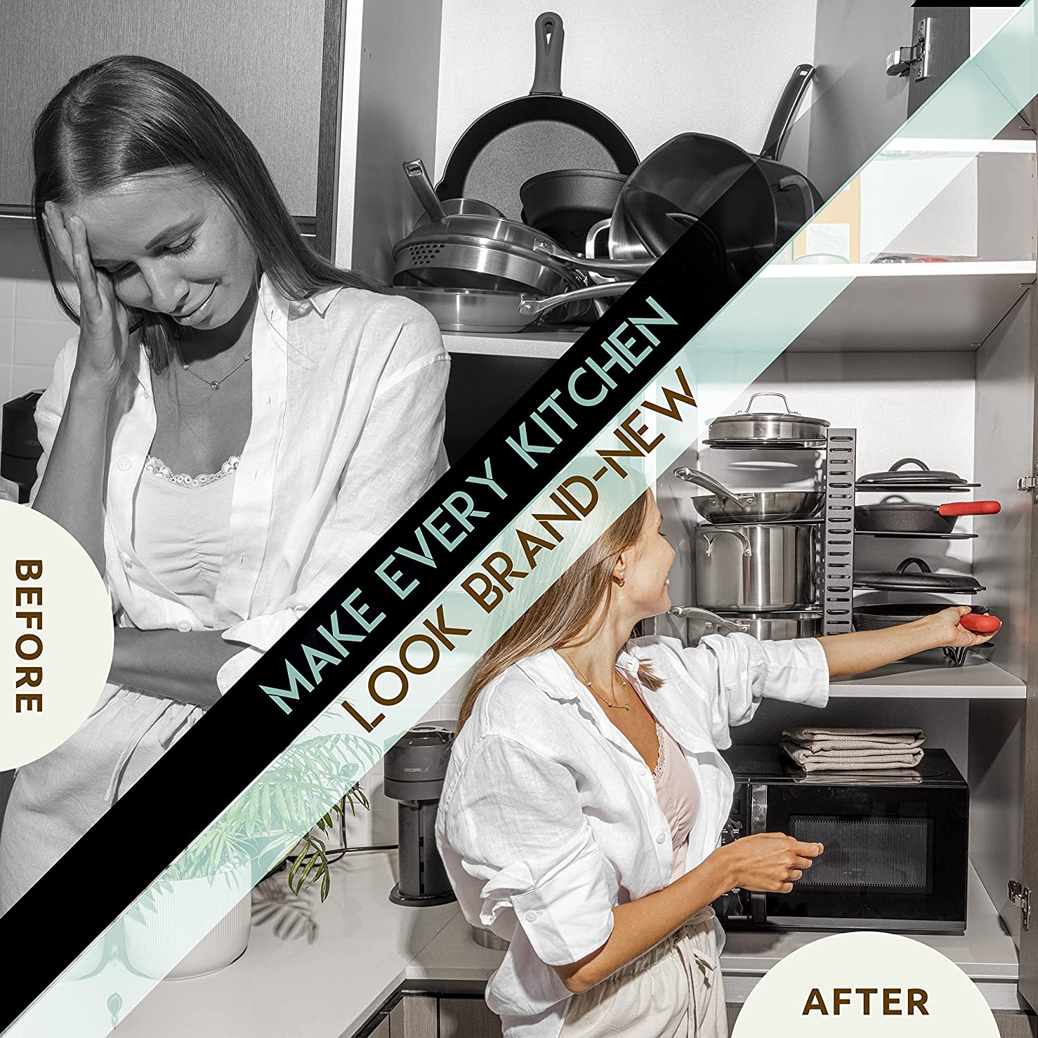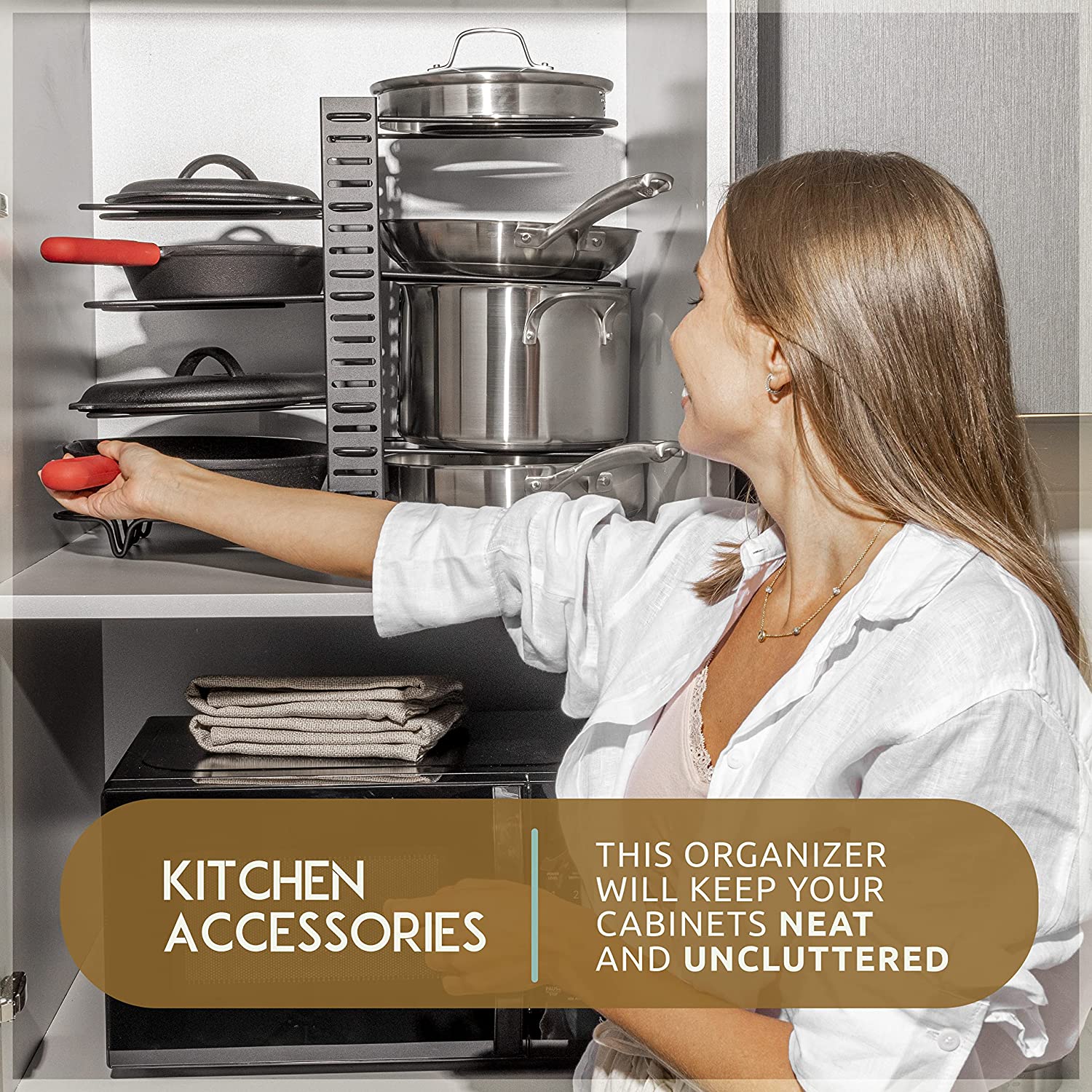 ��Large Storage Capacity��This height and position adjustable pot holders store up to 9 frying pans, sauce pans, griddles or pots of various sizes. It’s a perfect solution for storing all the pot and pan, saving you lots of space in thekitchen or in cabinet and countertop.