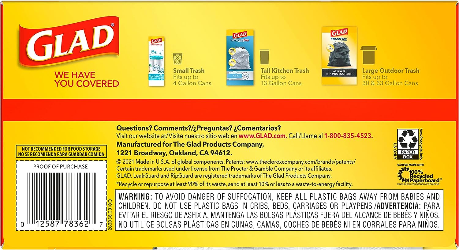 - 13 gallon kitchen trash bags: add glads 13 gallon kitchen trash bags to household cleaning supplies to tackle messes of all sizes; packaging may vary