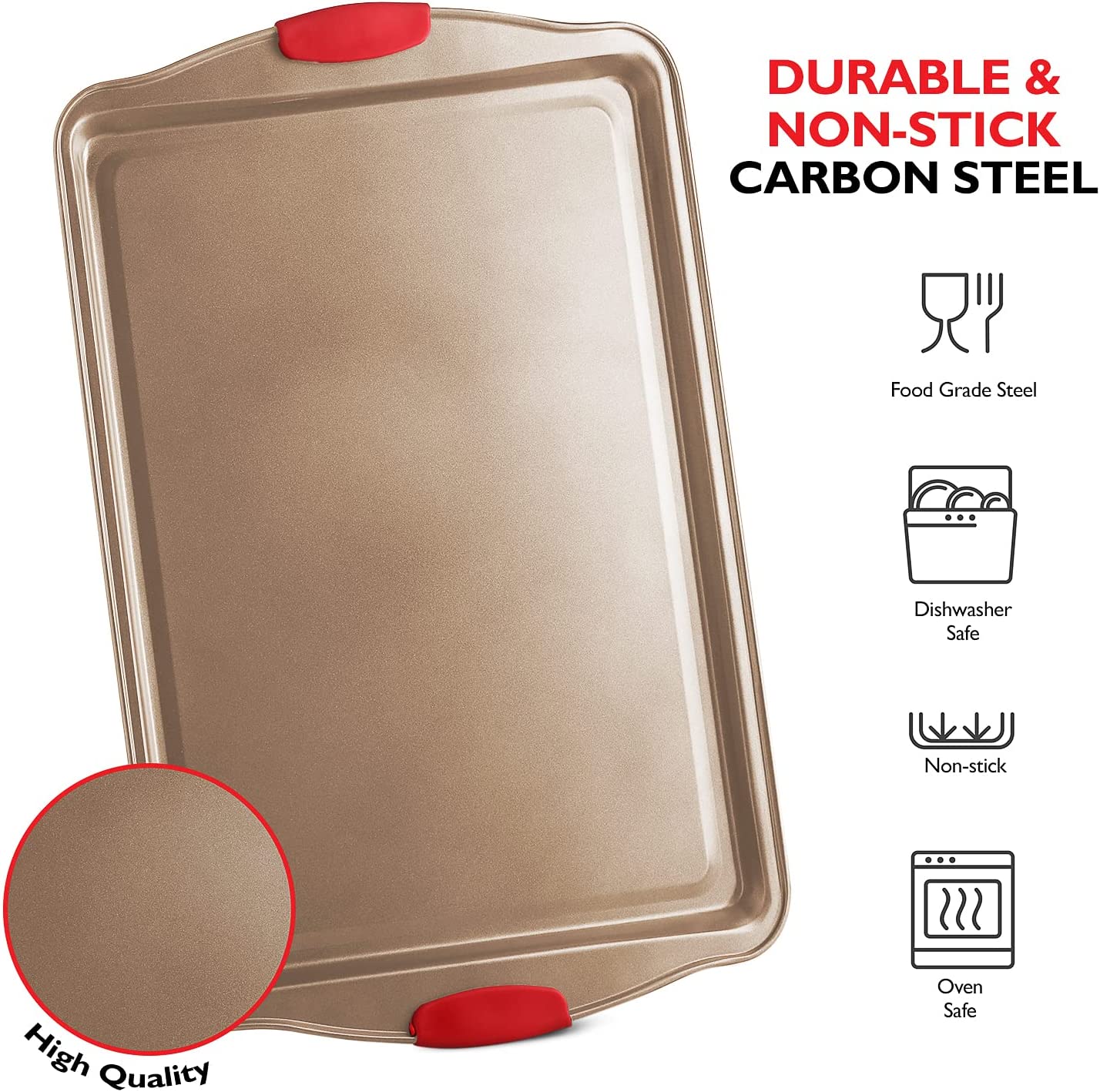 - SAFE N COMFORT SILICONE HANDLES: The commercial-grade restaurant-quality kitchen bakeware features red silicone grips on all bakeware pans to prevent burns and offer you offer plenty of solid, comfortable grasp, even with potholders. We also included an extra set of 5 silicone spatulas to help you out with your delicious baking!
