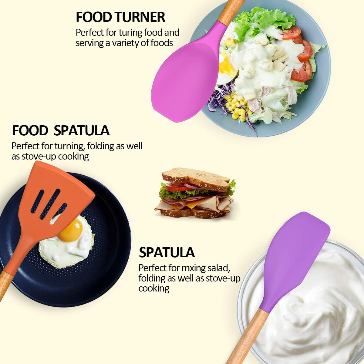 - FOOD GRADE SILICONE: Made of food-grade silicone, BPA-free, can use in any type of food. And it will probably last longer than the other plastic kitchen utensils. This silicone cooking utensils does not react with food or beverages, you don��t have to worry about the health of your families will not retain odors or colors, Before the first use, the original smell will disappear after the silicone soaking in water and exposed it to the air for about 3 hours