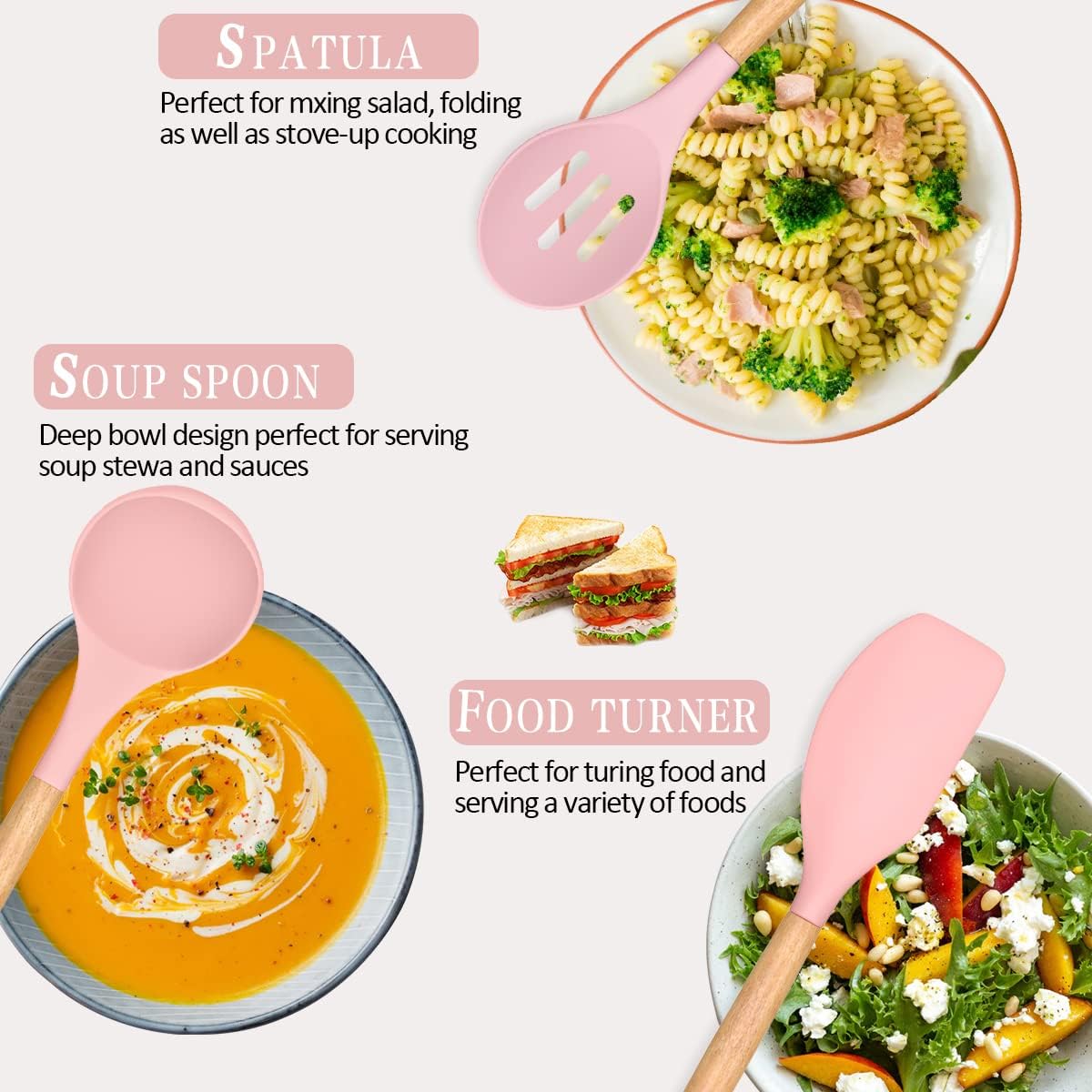 - 33 DURABLE WOODEN HANDEL KITCHEN UTENSILS SET: Anti scalding protect your hand from burning, 33 professional silicon Kitchen utensil set includeshe set includes flexible spatula, soup ladle,serving spoons pasta server, spatula turner , tongs, mesuring cup and spoons, 10 hooks, silicone mat and so on. Meet your all kinds of kitchen needs, Because of the wooden handle, We don't recommend soaking in water for a long time or dishwasher cleaning