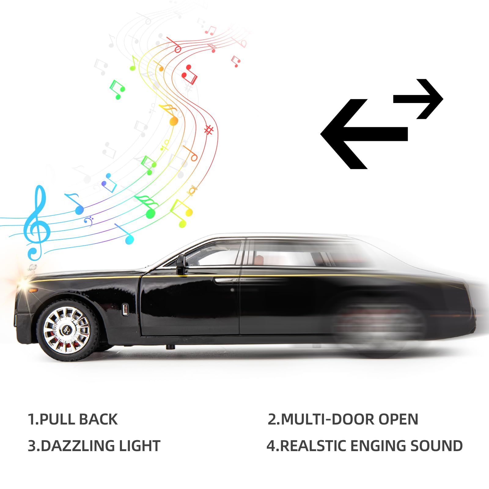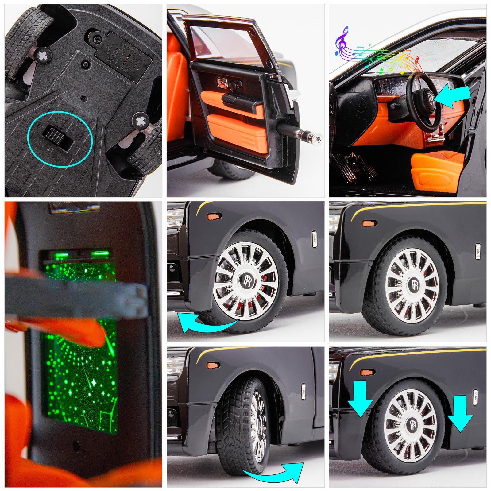 【Function game】 The front and rear doors, hood and trunk of the car can be opened; Three gears switch, respectively off, on and light mode. Different play styles can be selected according to different situations. The installation of a strong pull-back device can slide on the smooth desktop. With ultra-luxurious lighting effects and sound effects, the Rolls Royce starry hood can be changed to multiple colors and multiple different sound effects.