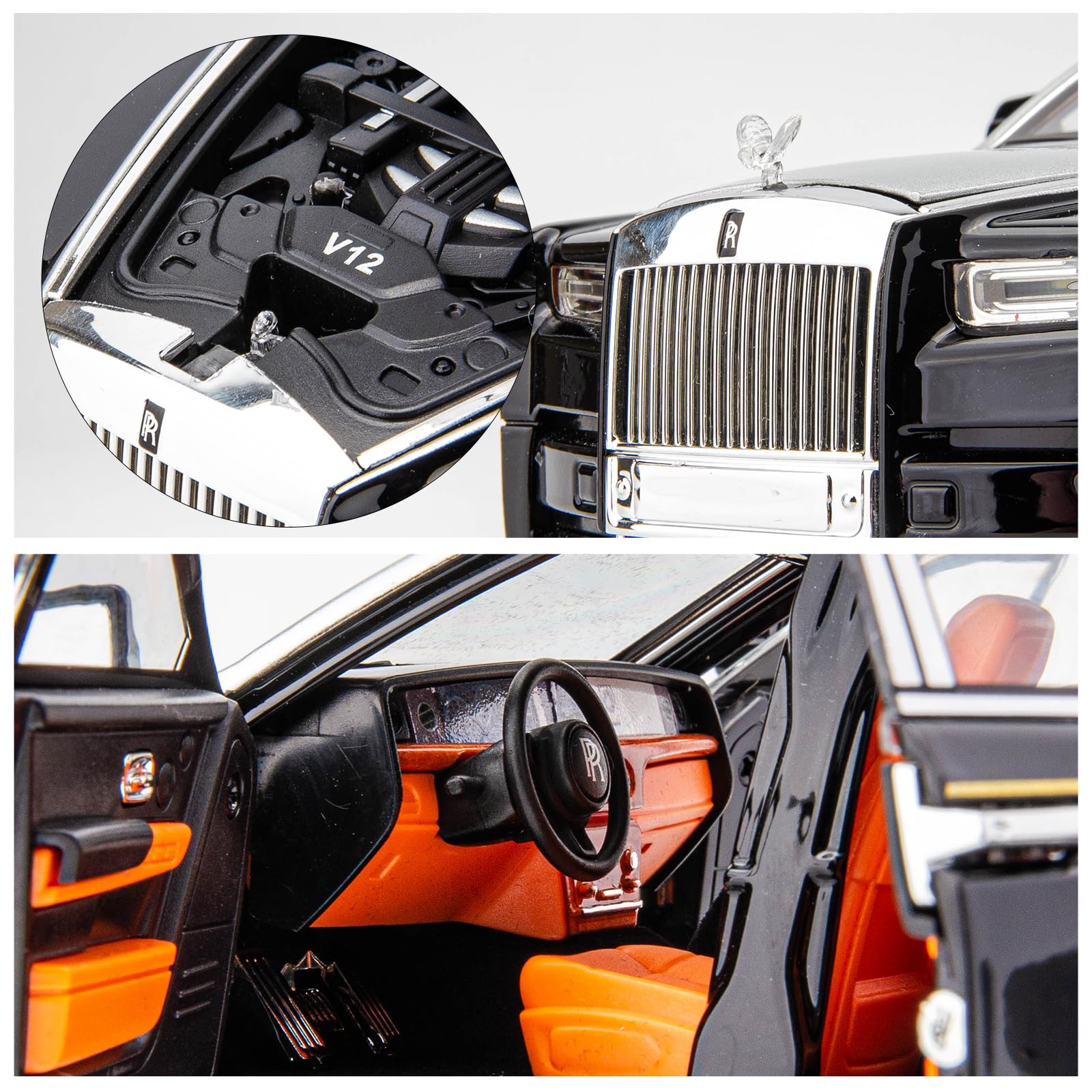 【Realistic Modeling, Detailed Workmanship】The car is a 1/18 scale Rolls-Royce car model.The car is realistically modeled and finely crafted.The umbrella can be pulled out, the statue of the goddess of joy can be hidden, and the car armrest cover can be opened.