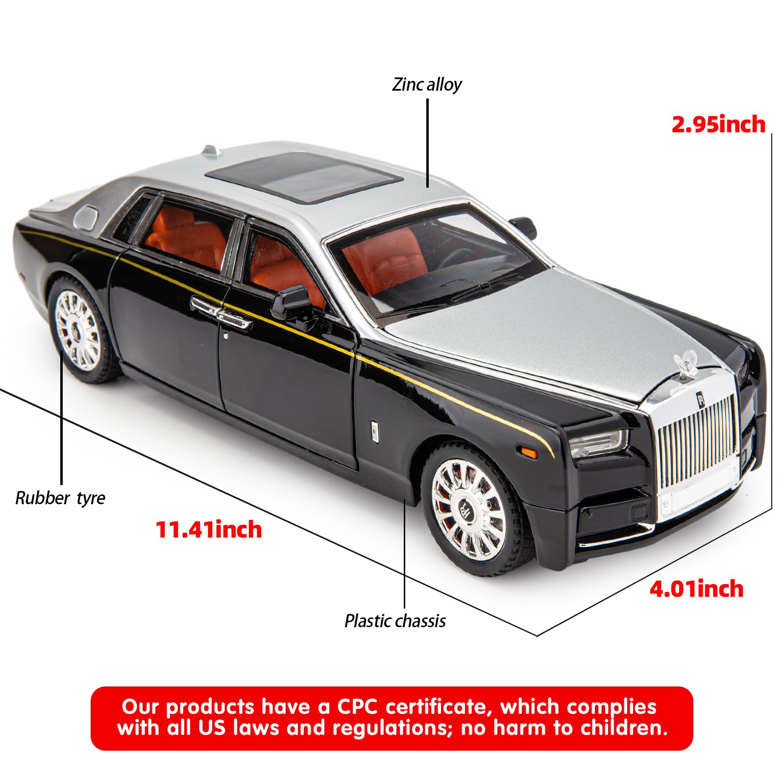 1/18 Rolls-Royce Phantom model car, realistic car modeling, exquisite workmanship. High degree of freedom and diverse play. The car is made of zinc alloy, plastic parts and rubber tires. Our products are CPC certified and comply with all US laws and regulations; harmless to children.