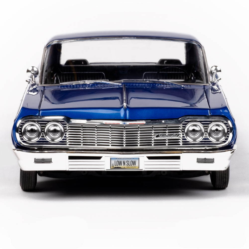 Every detail of the SixtyFour was painstakingly and passionately created with scale accuracy and detail. The Impala SS interior and exterior badging adorn the 1964 Impala SS body and interior. 23 individual chrome-plated molded parts are used to create the body's accessories. Optional LED lights are available for nighttime cruising. Clear windows feature high-quality chrome foil trim to complete the ultra-realistic appearance. The attention to detail continues below the body, with the chassis frame, faux transmission, and functional solid rear axle with a removable differential cover.