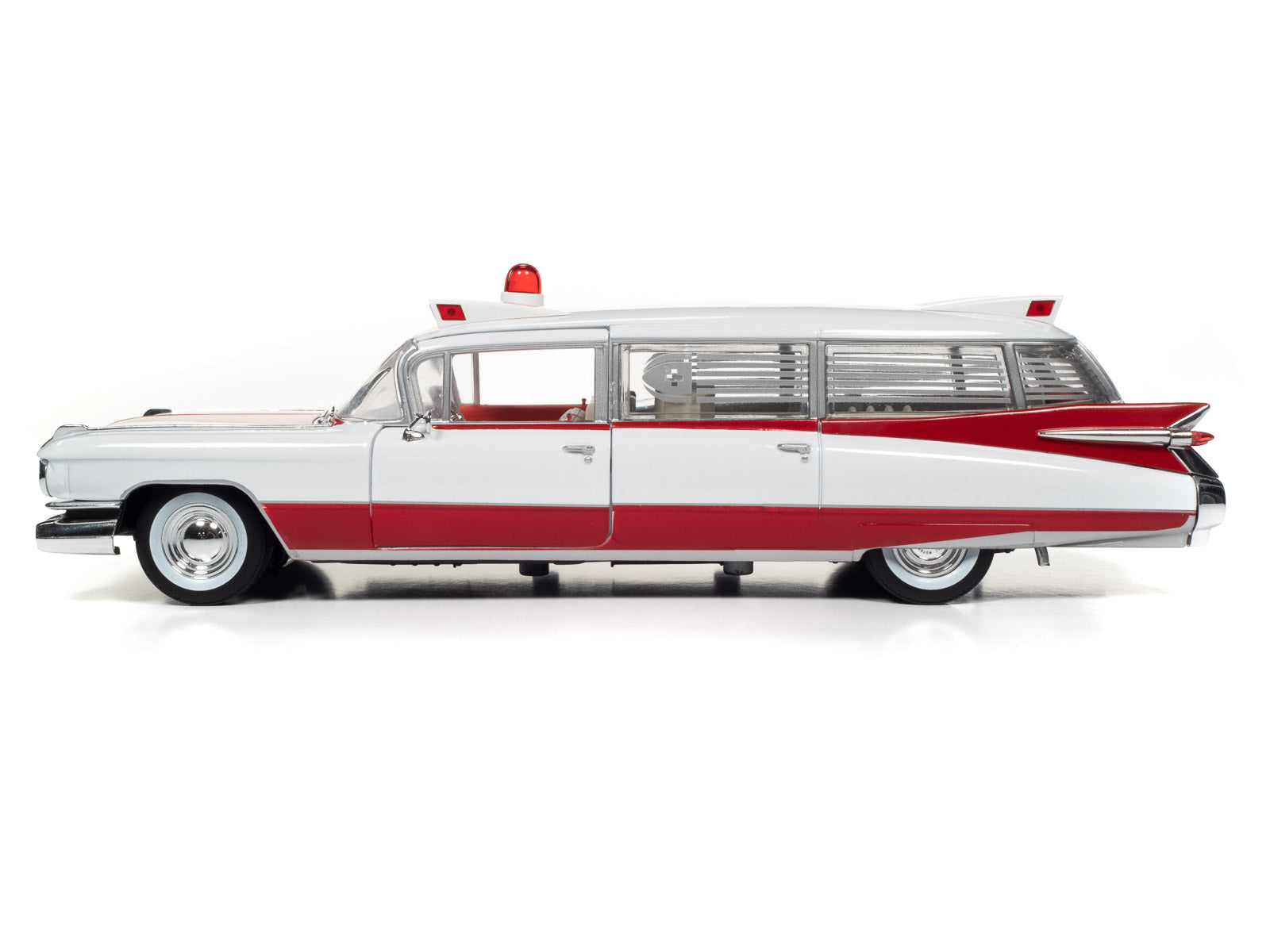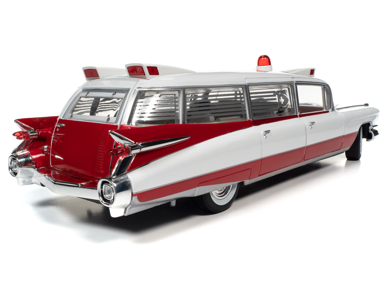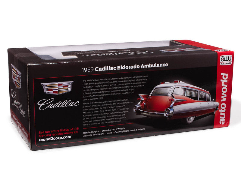 For the first time, Auto World has replicated this 1959 Cadillac Ambulance in 1:18 scale! This die-cast shares the iconic tailfins from the 1959 Cadillac Eldorado. Mounted to the roof is a NEWLY TOOLED bubble light flanked by red-lensed emergency flasher housings on all four corners. Featuring period-correct red and white two-tone paint, this iconic 50s ambulance is ready to resuscitate your die-cast collection!
