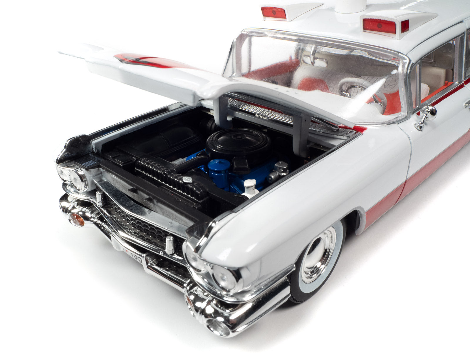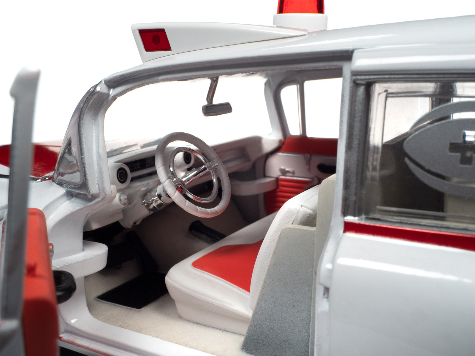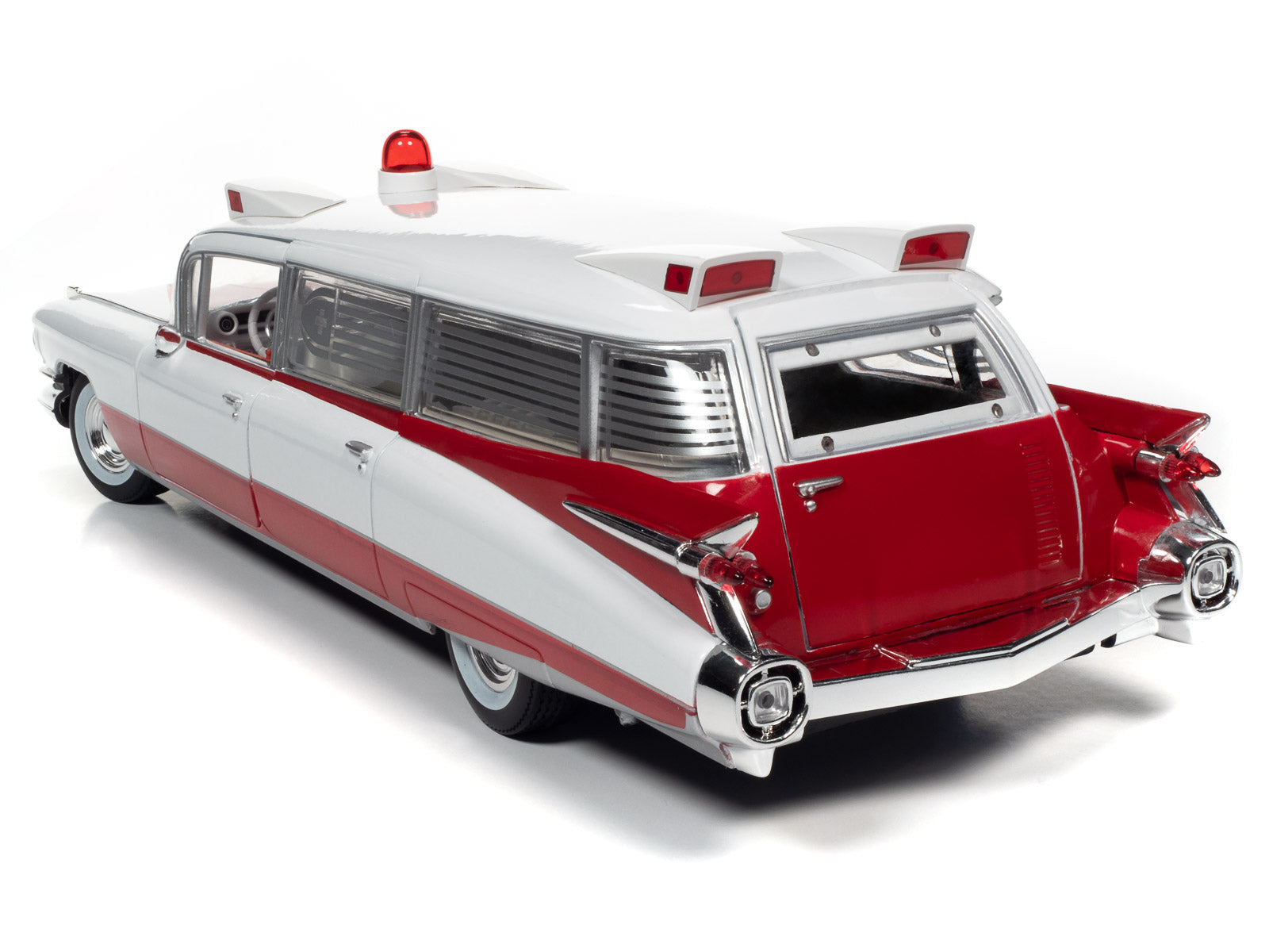 For the first time, Auto World has replicated this 1959 Cadillac Ambulance in 1:18 scale! This die-cast shares the iconic tailfins from the 1959 Cadillac Eldorado. Mounted to the roof is a NEWLY TOOLED bubble light flanked by red-lensed emergency flasher housings on all four corners. Featuring period-correct red and white two-tone paint, this iconic 50s ambulance is ready to resuscitate your die-cast collection!