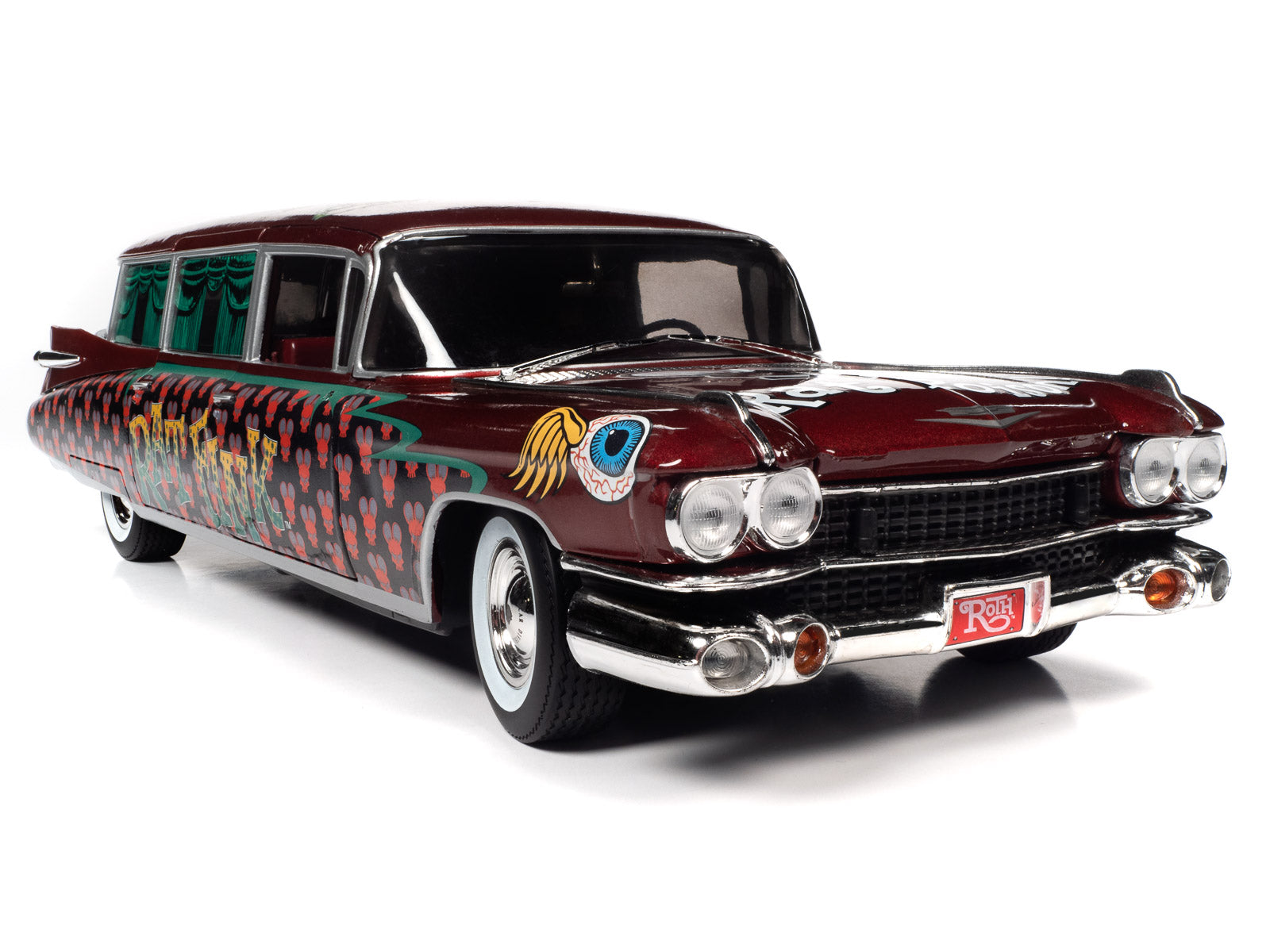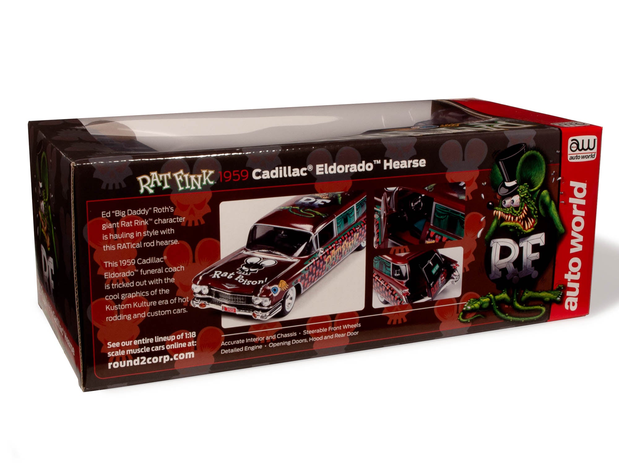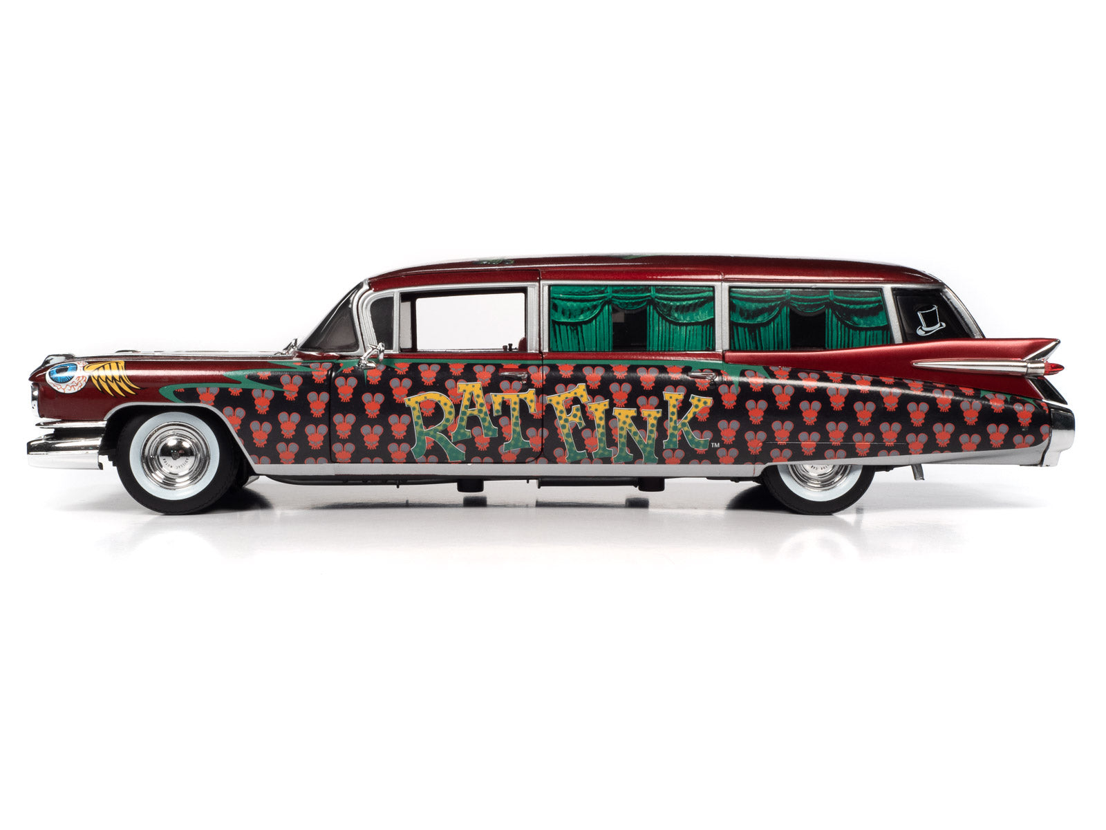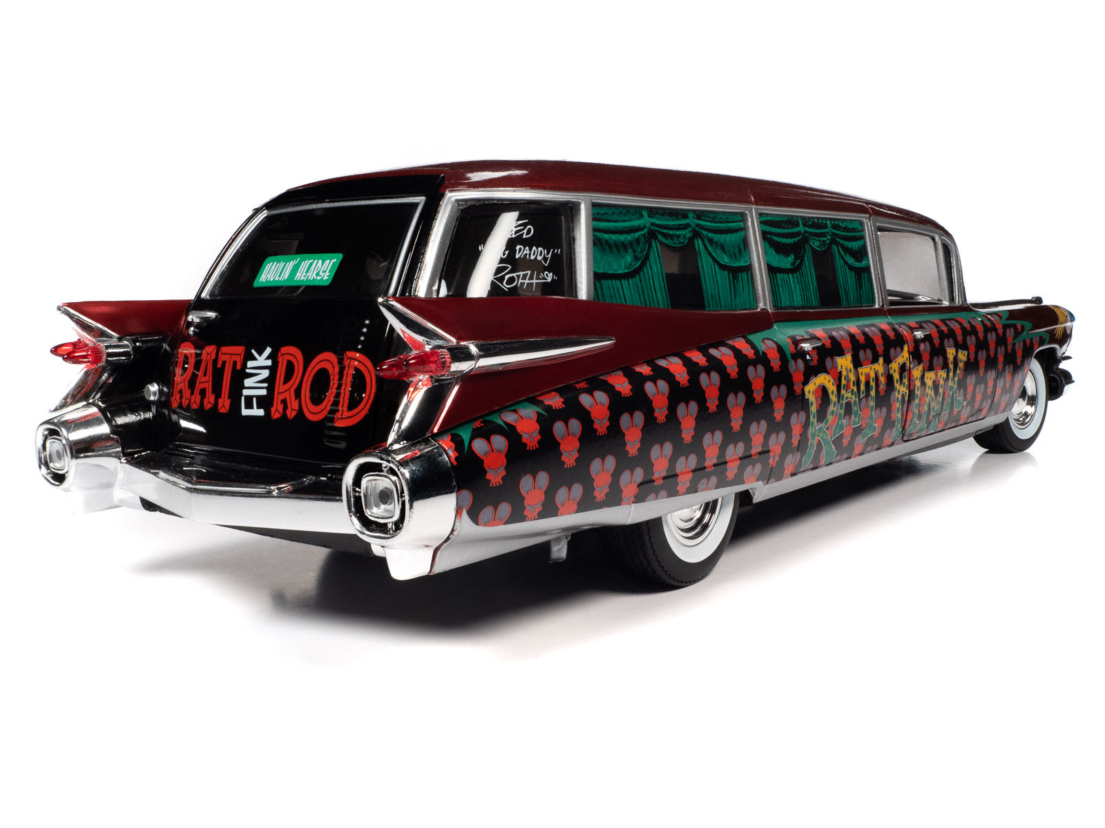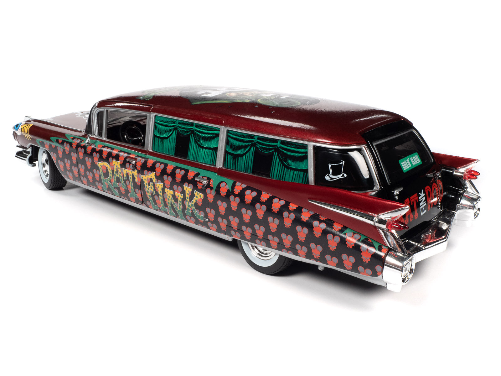 Ed “Big Daddy” Roth’s giant Rat Rink™ character is hauling in style with this RATical rod hearse. This 1959 Cadillac® Eldorado™ funeral coach is tricked out with the cool graphics of the Kustom Kulture era of hot rodding and custom cars.