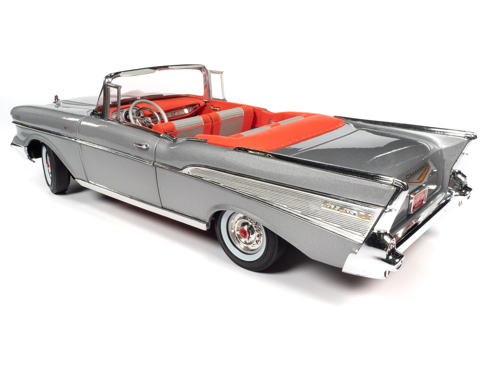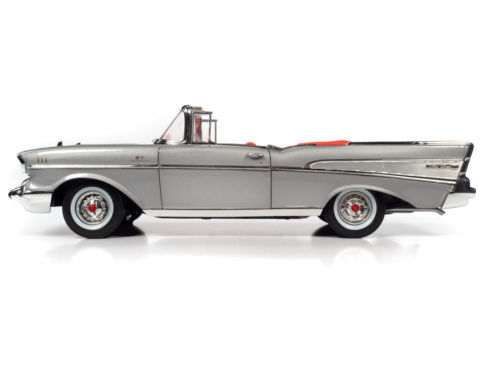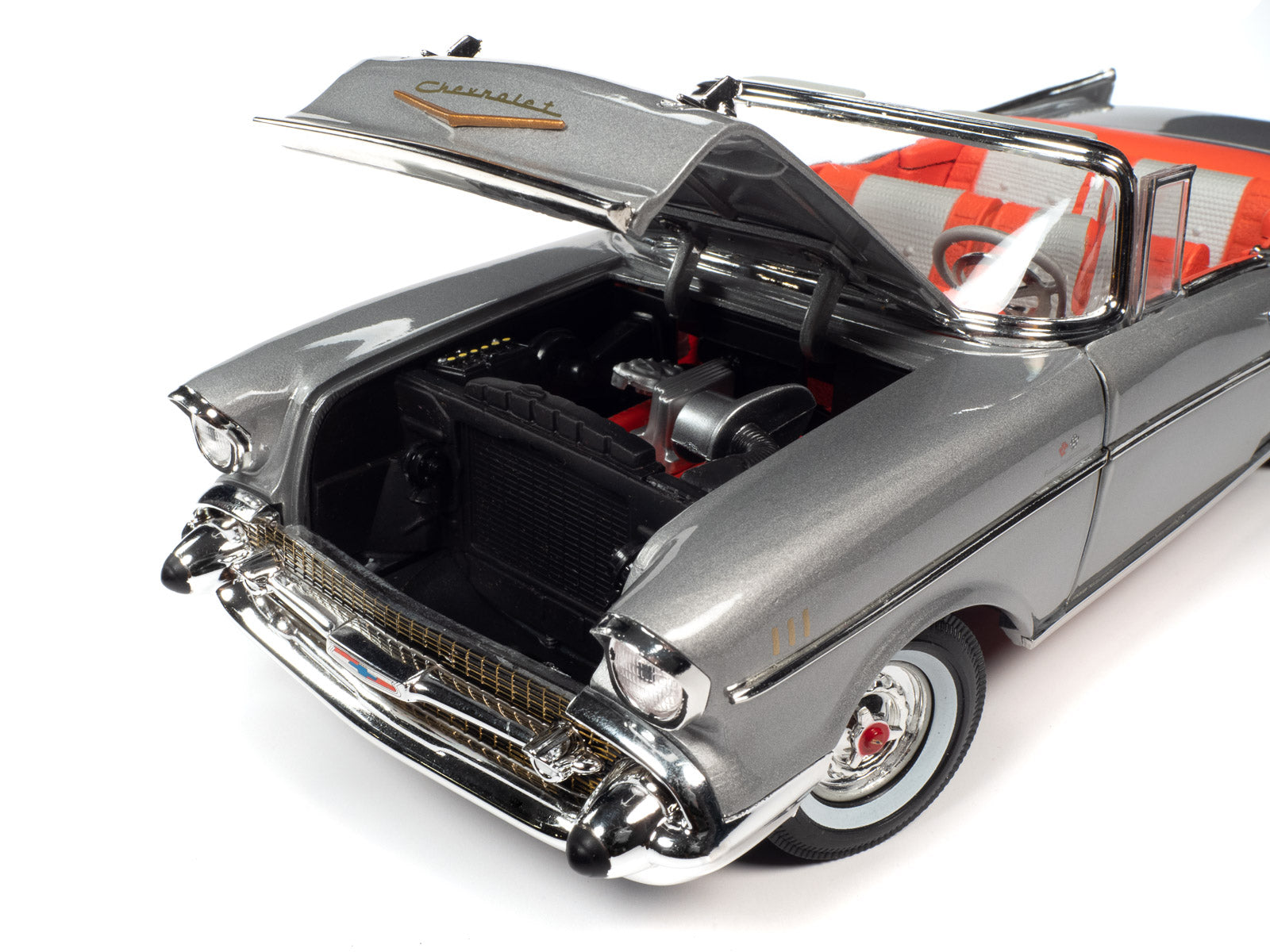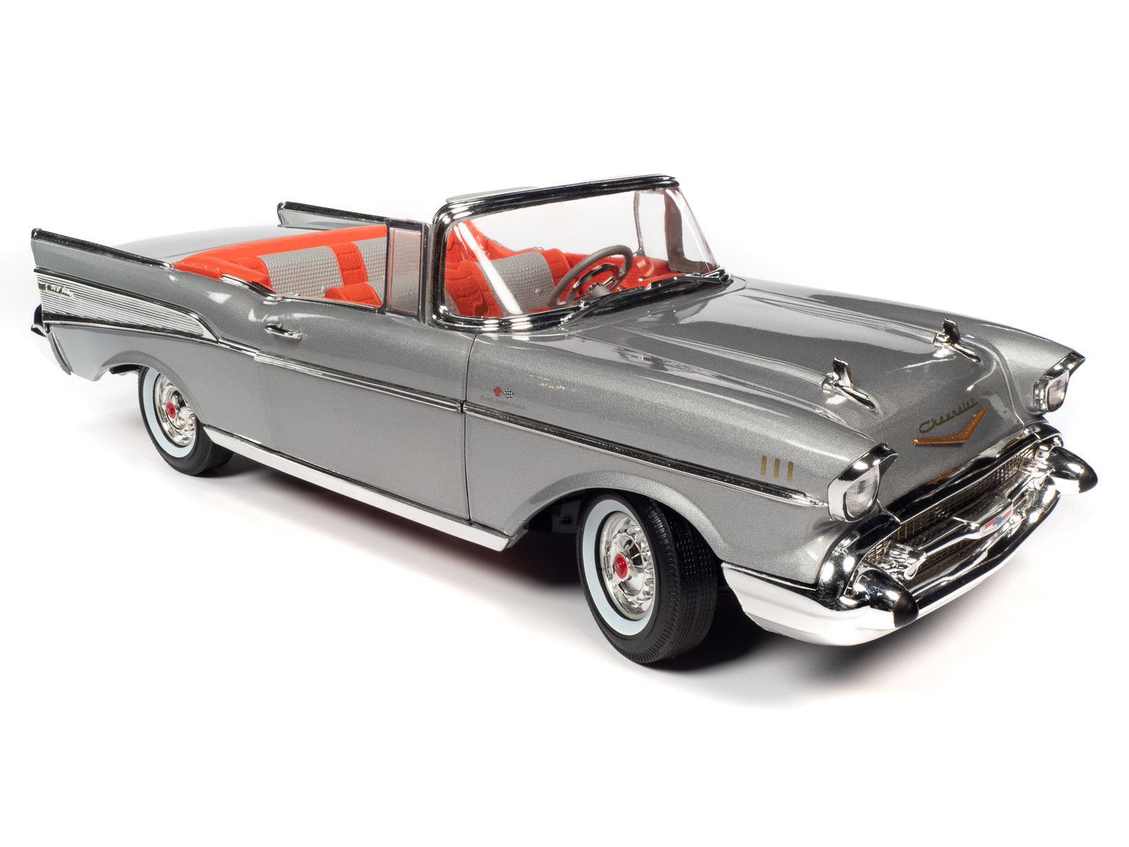 Auto World has replicated this beautiful 1957 Chevy Bel Air convertible “fuelie” in bold Inca Silver paint with striking red and silver interior.