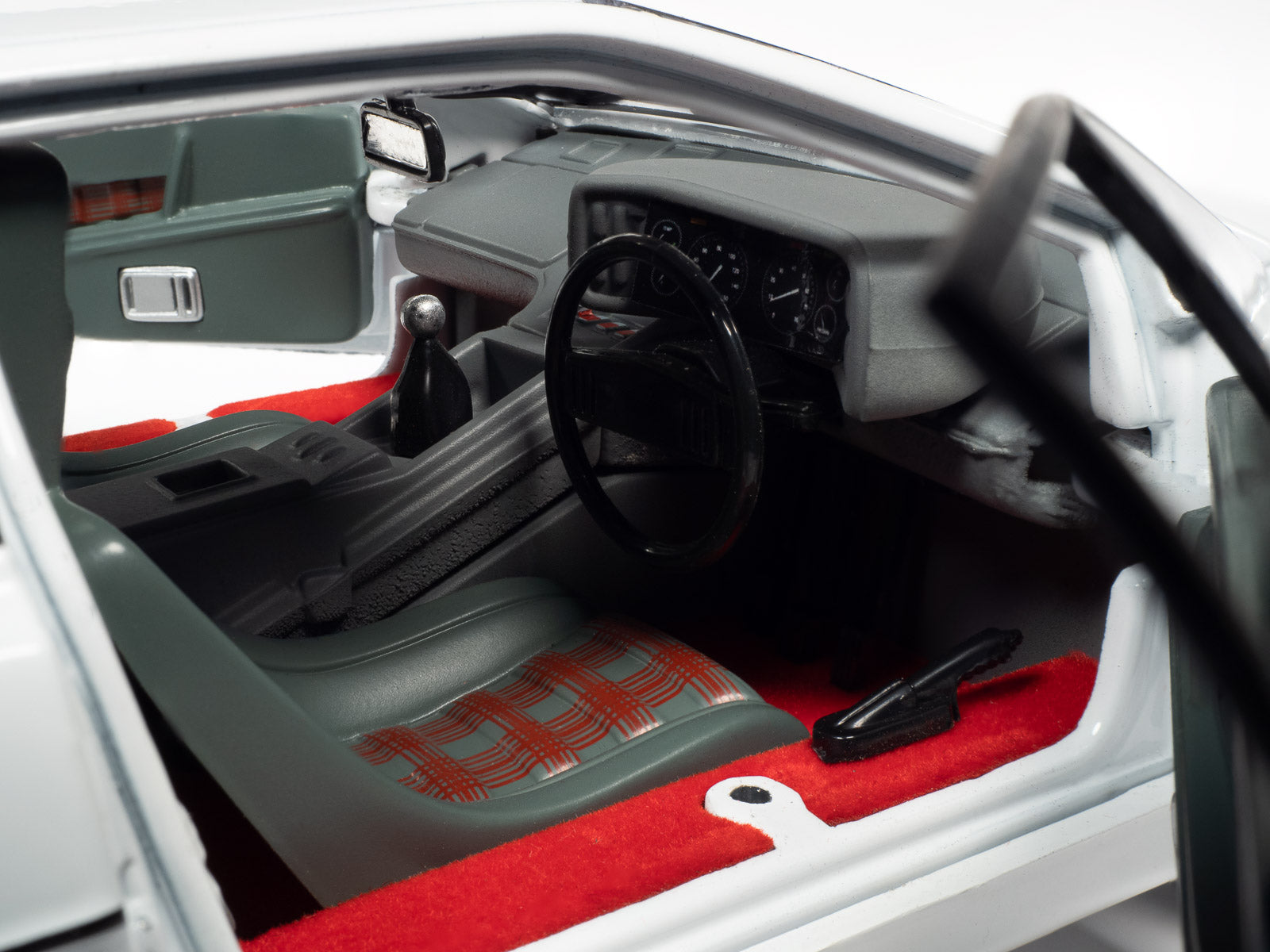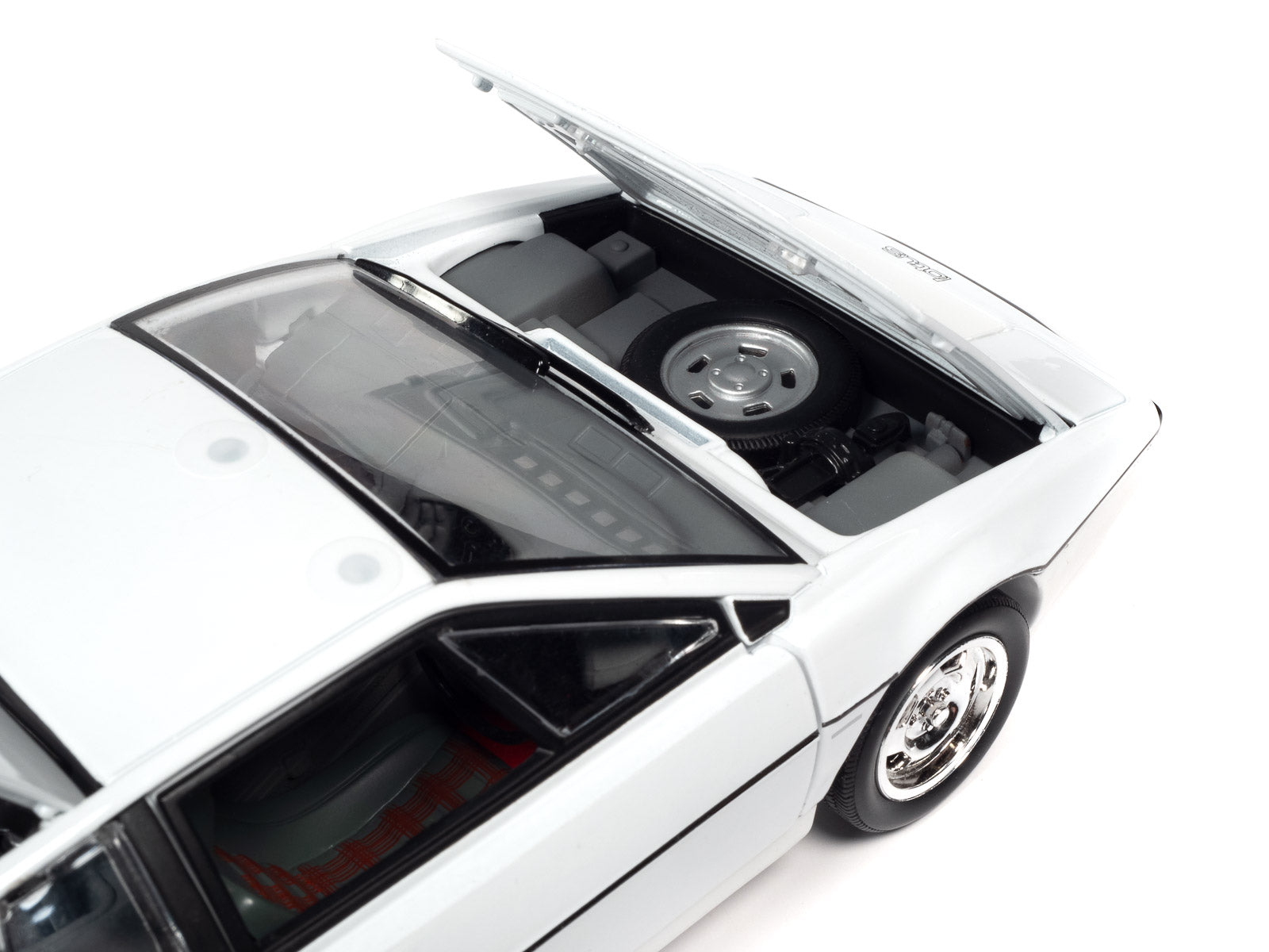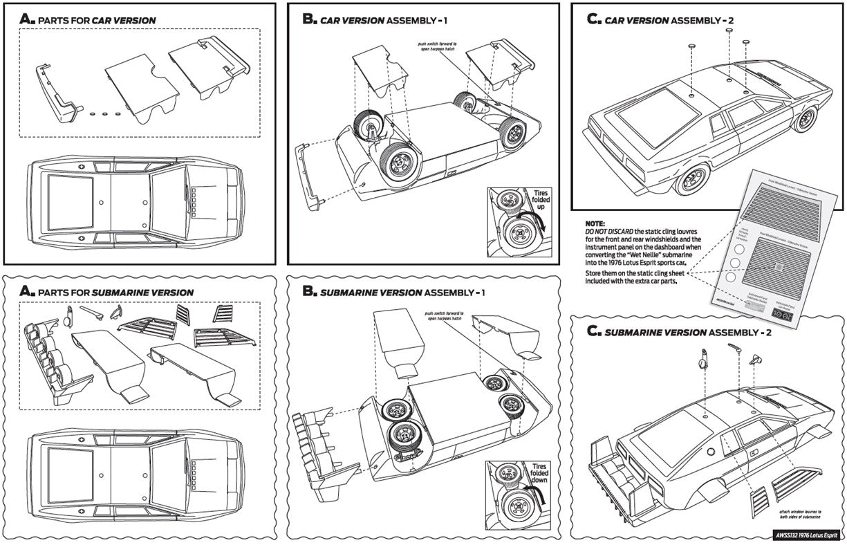 Auto World is proud to replicate this Lotus S1 submarine car as seen in The Spy Who Loved Me. It was fondly referred to as “Wet Nellie” as a tribute to Bond’s auto gyro "Little Nellie” from You Only Live Twice. Its many gadgets include wheel arches that transform into fins, a small periscope, missile launcher from the rear deck, underwater mines, black dye from the back, and torpedoes from the front. As well as being amphibious, the highly armed car has cannons that spray cement on to pursuing vehicles. This 1:18 die-cast is replicated as the famous submarine, but we’ve also included the chassis parts and instrument panel to turn it back into the Lotus Esprit sports car!