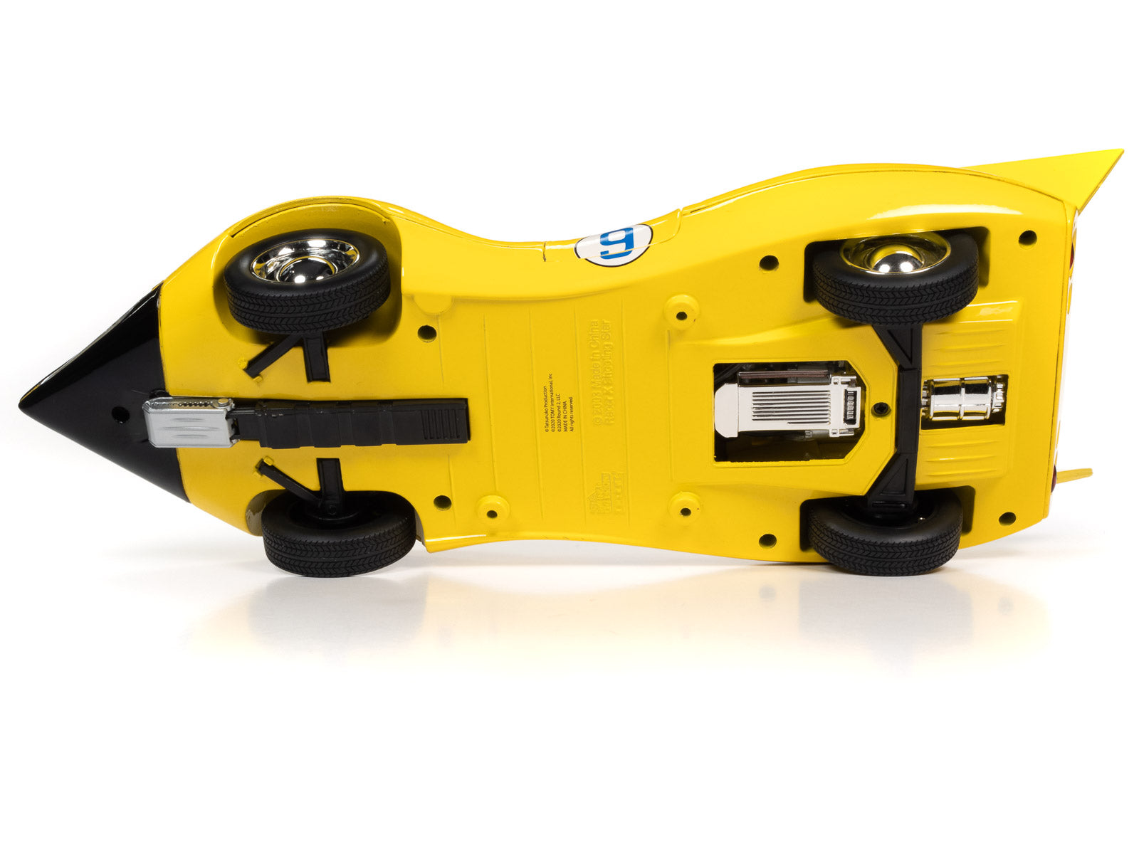 The Shooting Star is a very agile machine painted bright yellow with a powerful engine in the rear. Its driver, Racer X, is a secret agent, so the car is equipped with many high tech weapons to fight crime. Onboard radio equipment allows him to communicate with spy/intelligence agency. Slick pumps are in the rear to throw oil behind and foil bad guys. The Shooting Star can continue racing, even after losing a rear wheel. Some of the features shown on this die-cast replica are carried over from the original Japanese Mach Go Go Go series.