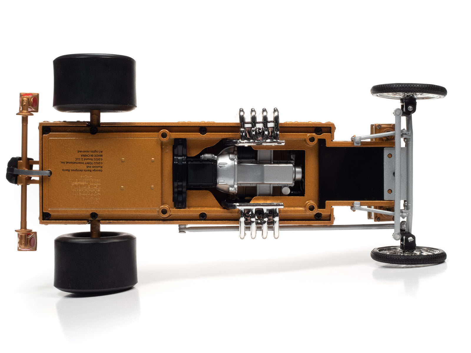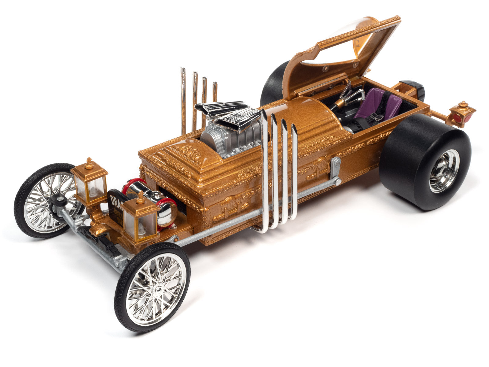 The DRAG-U-LA was created from a real fiberglass coffin equipped with a four-speed manual stick, 350hp Ford Mustang 289ci V-8 with dual four-barrel carbs, all fitted to a Mickey Thompson Ram-Thrust manifold. If you’re brave enough to hit the gas, the bone-shaking organ-pipe exhaust will wake the dead! The front of the vehicle sports a marble gravestone with the legend: “Born 1367, Died ?”. The royal purple driver seat is located under a plastic bubble in the rear of the coffin. In the spirit of all things fright’ning, this authentic spine-chilling 1:18 replica is dying to be added to your collection!