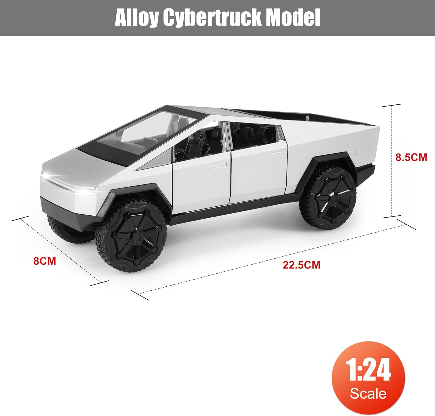 - Cybertruck Toy : 1/24 Cybertruck metal diecast model measures 8.8" X 3.2" X 3.3". This Cybertruck toy is crafted with realistic details of the real Cybertruck vehicle, a metal body with plastic parts, rubber tires, and detailed interior and exterior trim.