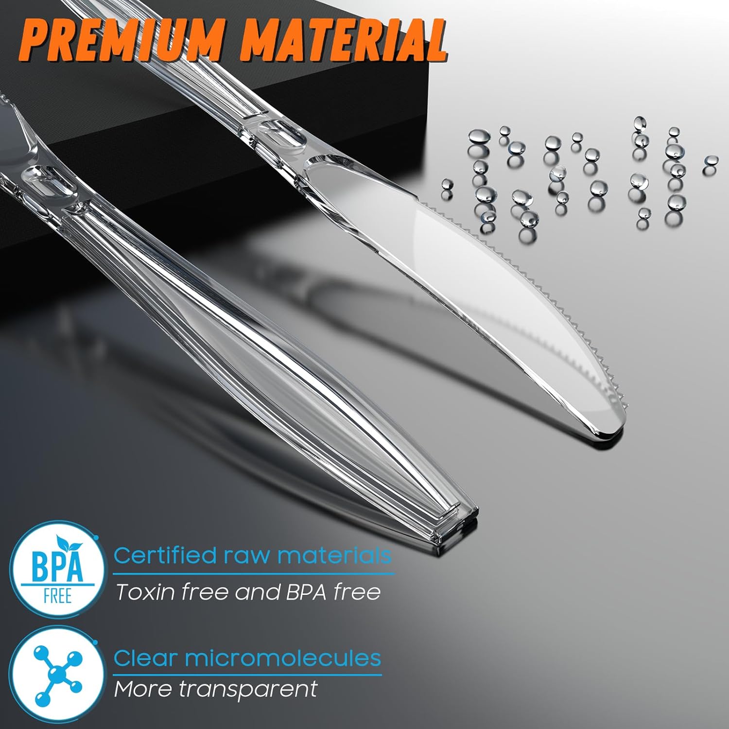 - ��Premium Material锟�? Our clear plastic Silverware are made of heavy weight food-grade polystyrene, totally BPA-free & Toxin-Free. Premium material lead your healthy life.
