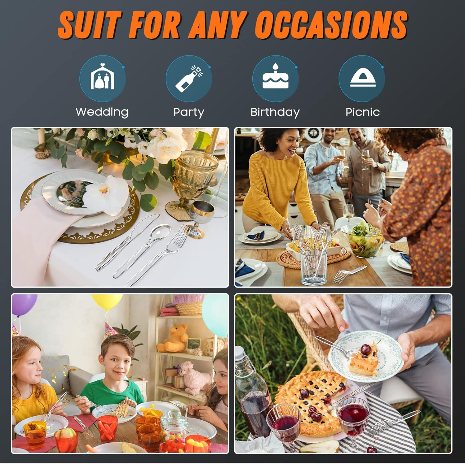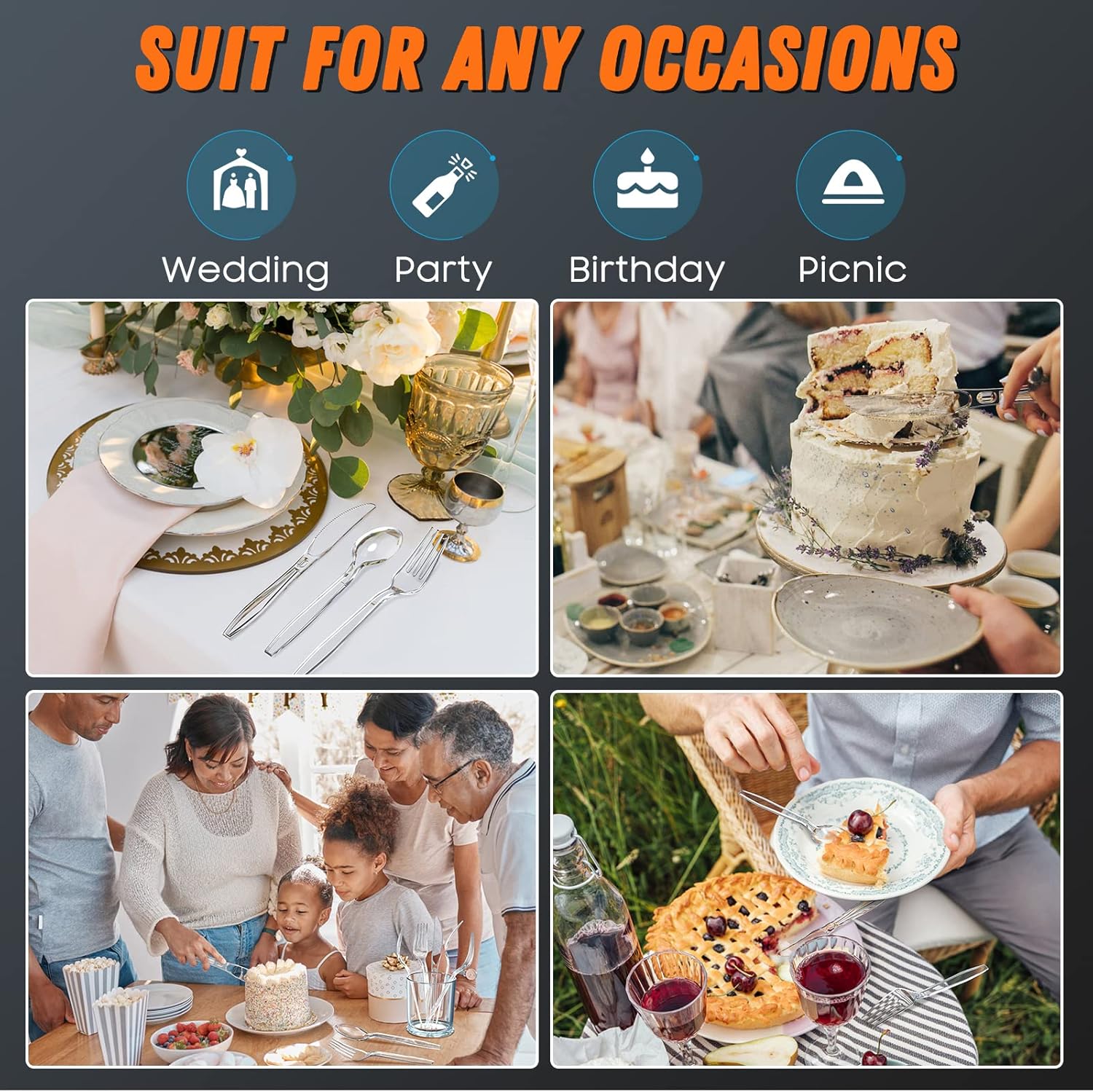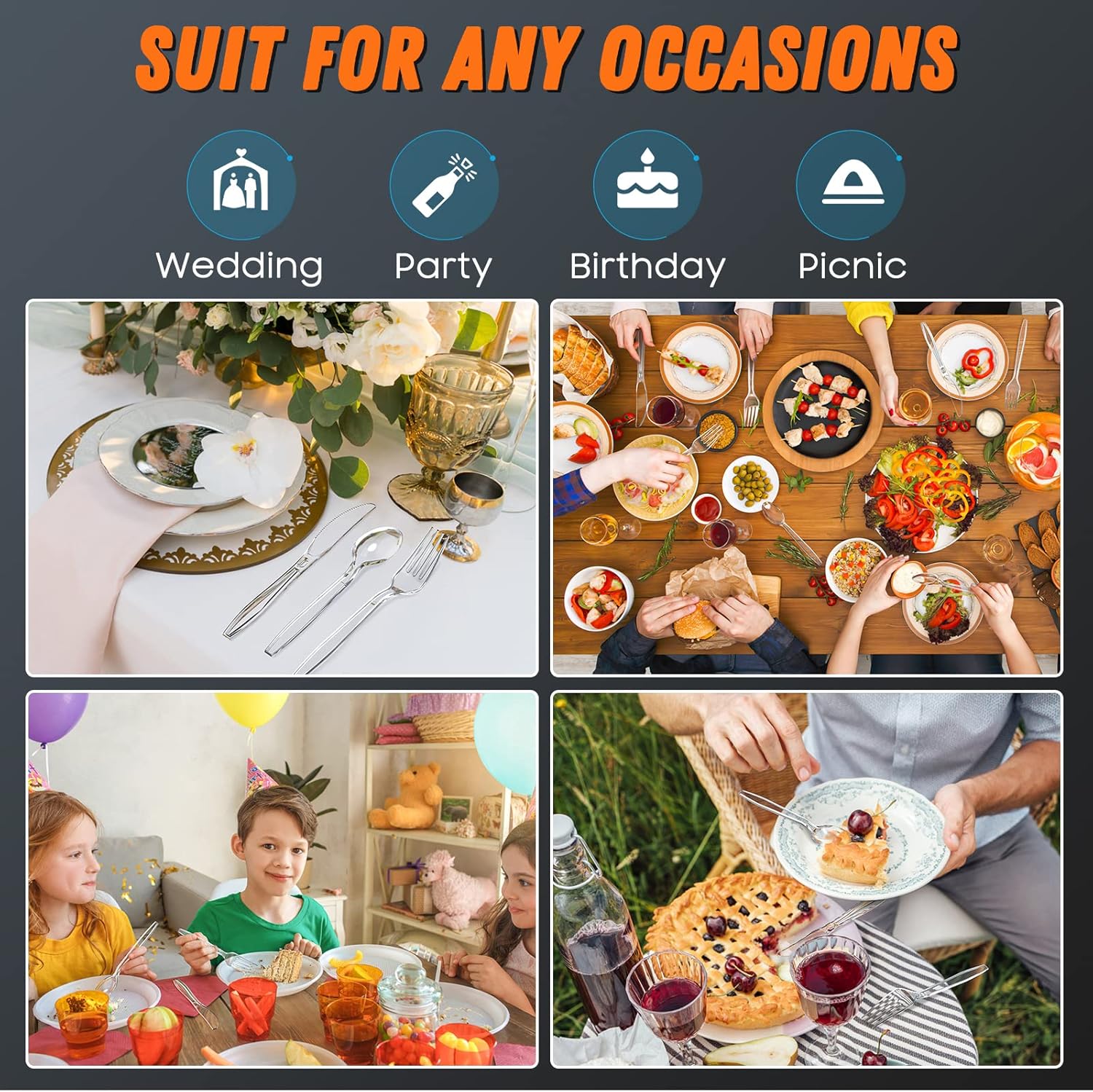 - ��Party Necessary��In a wedding, picnic, banquet, large dinner, party, or other event with lots of guests, you can use our cutlery to have almost all kinds of meals, such as pasta, desserts, salads, snacks, fruit and favorite meats. Ultimate convenience for your party preparation and clear up.