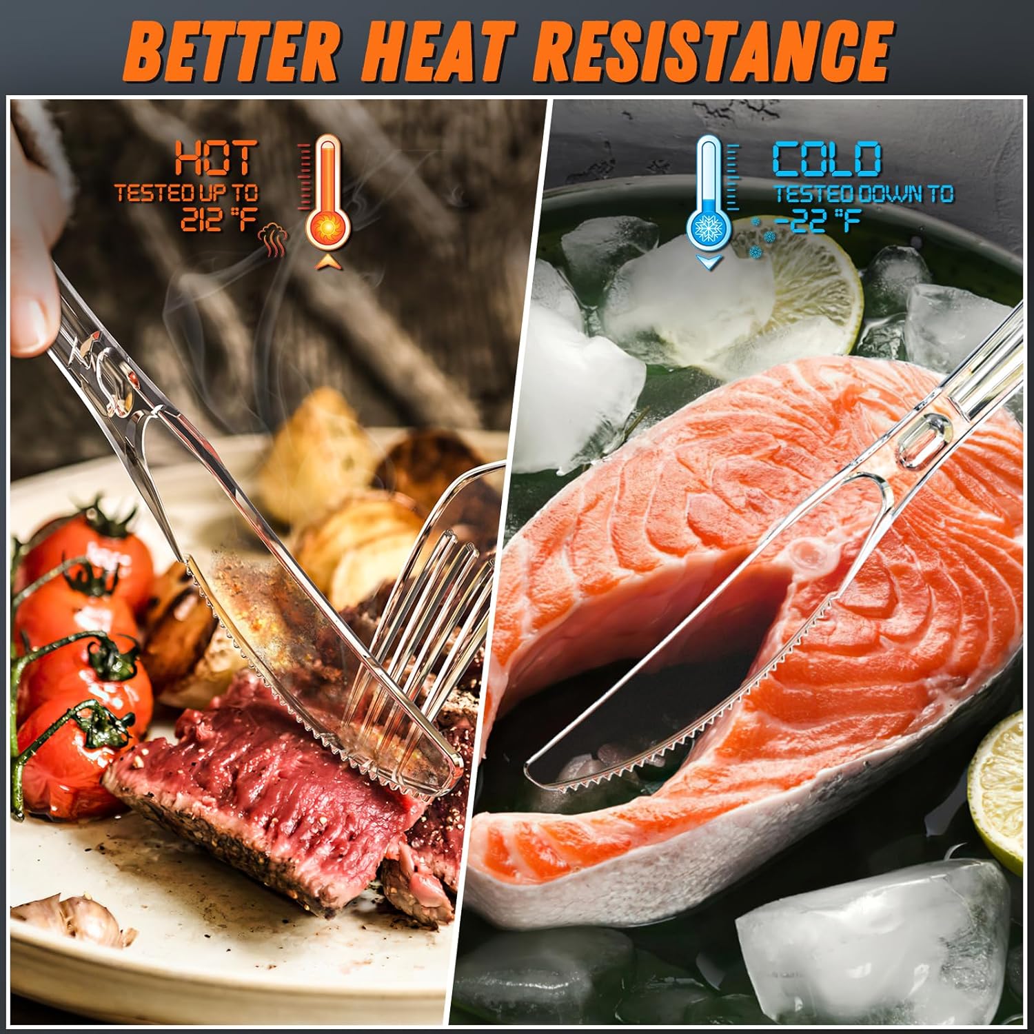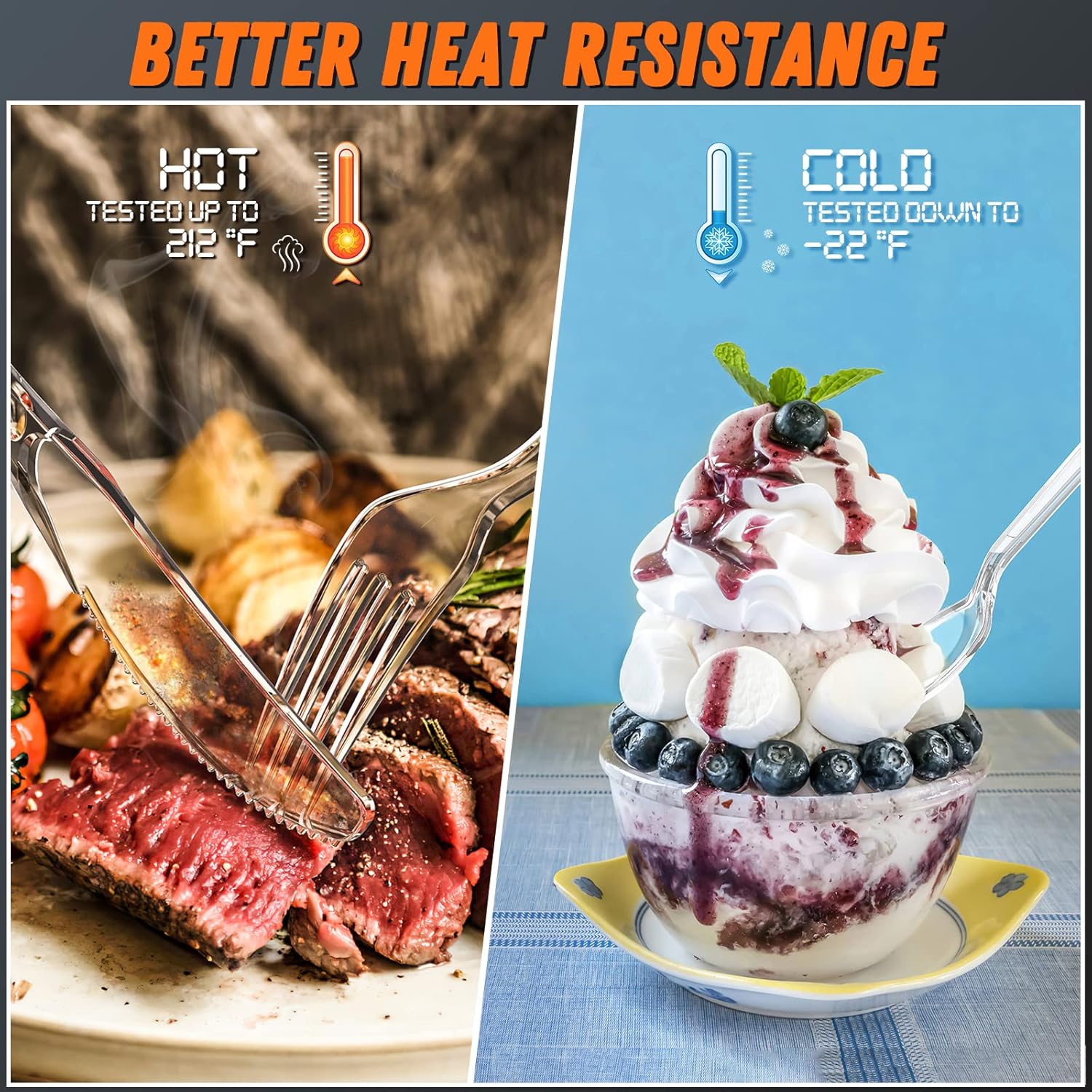 - ��Heat Resistance锟�? Upgraded material contribute to our plastic silverware better heat-resistant, Heavy duty forks has been tested from -22°F to 212°F. You can enjoy your delicious food with our plastic dinnerware, for hot food or cold food.