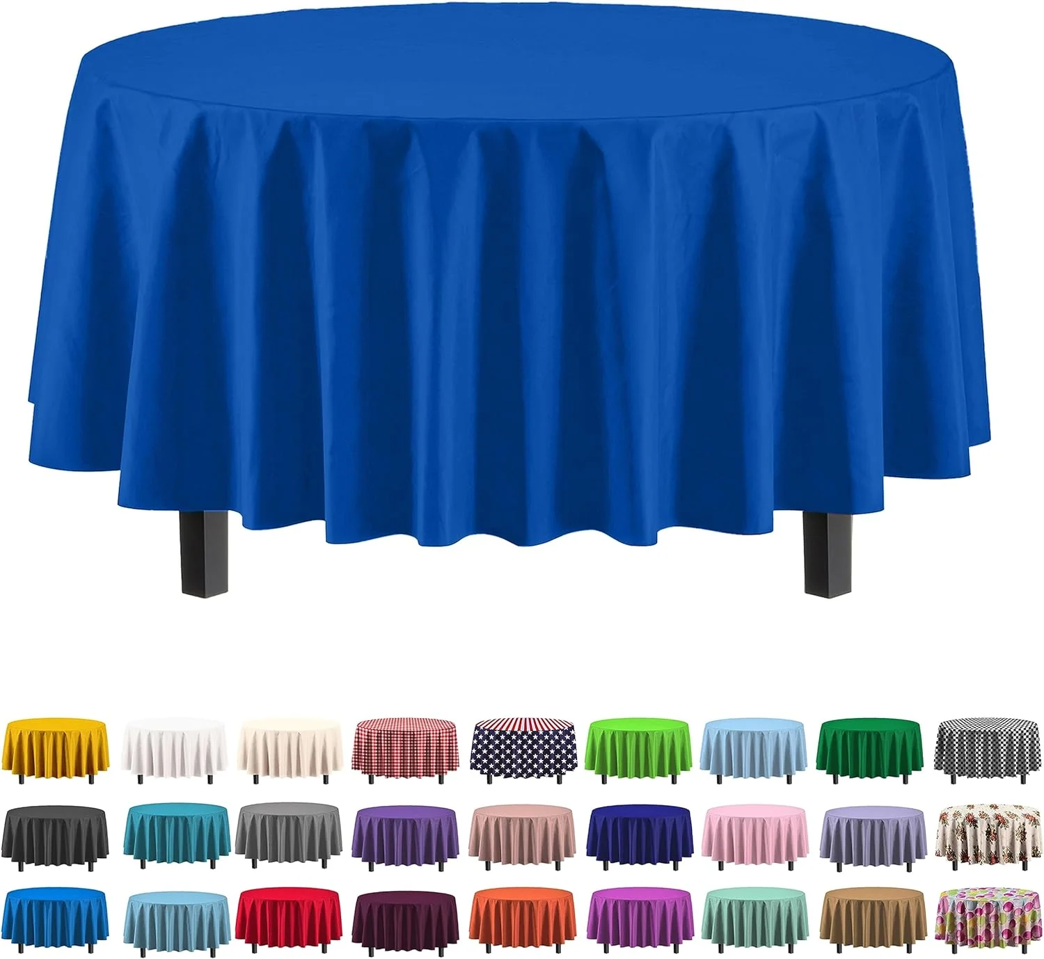 Our round dark blue tablecloths that measure 84 in. will instantly elevate your table adding color and style. It suits both people who prefer minimalistic style and glam themed tables. Each style can be achieved through decorating your table with our Combo Packs to dine on picturesque disposable tableware.Made from food grade plastic material, our collection of round table covers is certain to meet all of your party needs. Transitioning from one event to another is seamless with these disposable tablecloths. Whether it's a birthday bash, wedding reception, or corporate gathering, these covers fit right in, adding a polished look to your setting. The round shape ensures a perfect fit for round tables that measure up to 6 feet, creating a sleek and uniform appearance. Our collection offers extra high opacity for such an affordable price. They are made to withstand spills and protect your tables from scratches throughout the event. It is also a handy product to cover up deformities and scratches.